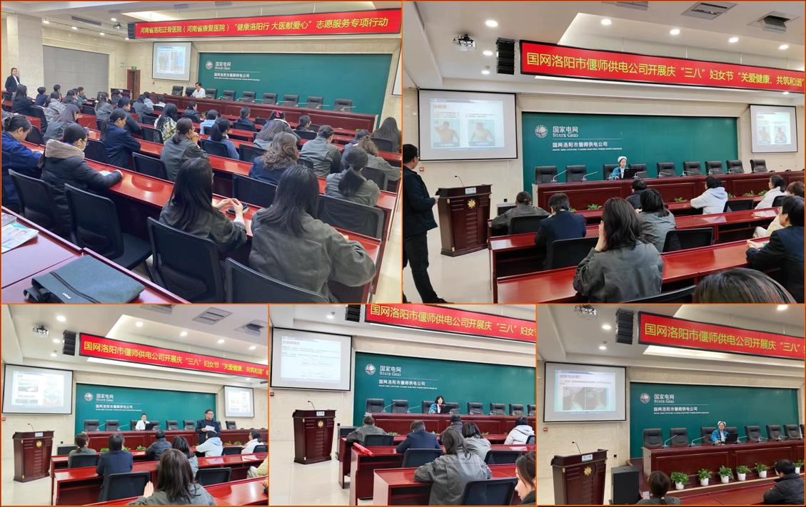在“三八”国际劳动妇女节到来之际,3月6日下午,我院康复院区脊髓损伤康复科主任王运龙,护士长王淑梅,主治医生赵晓琳、李毅伟,主管护师程玲玲一行,应邀来到国家电网洛阳市偃师供电公司,开展义诊及科普讲座活动。