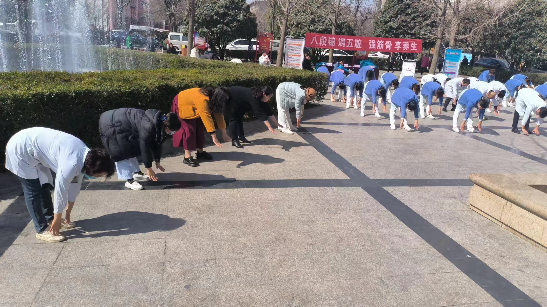 3月8日上午11点,由治未病门诊(中医护理门诊)及康复院区中医特色治疗区、中医护理学组等部门30余人,在护士长赵爱琴和苏春霞带领下,在高云峰广场(住院部一号楼前)表演传统医学导引术——国家体育总局标准八段锦,现场气氛活跃,观众跟学跟练。经常练习八段锦可强身健体,调和五脏,可以有效预防和缓解颈椎病、腰椎病,还有安神助眠的功效。