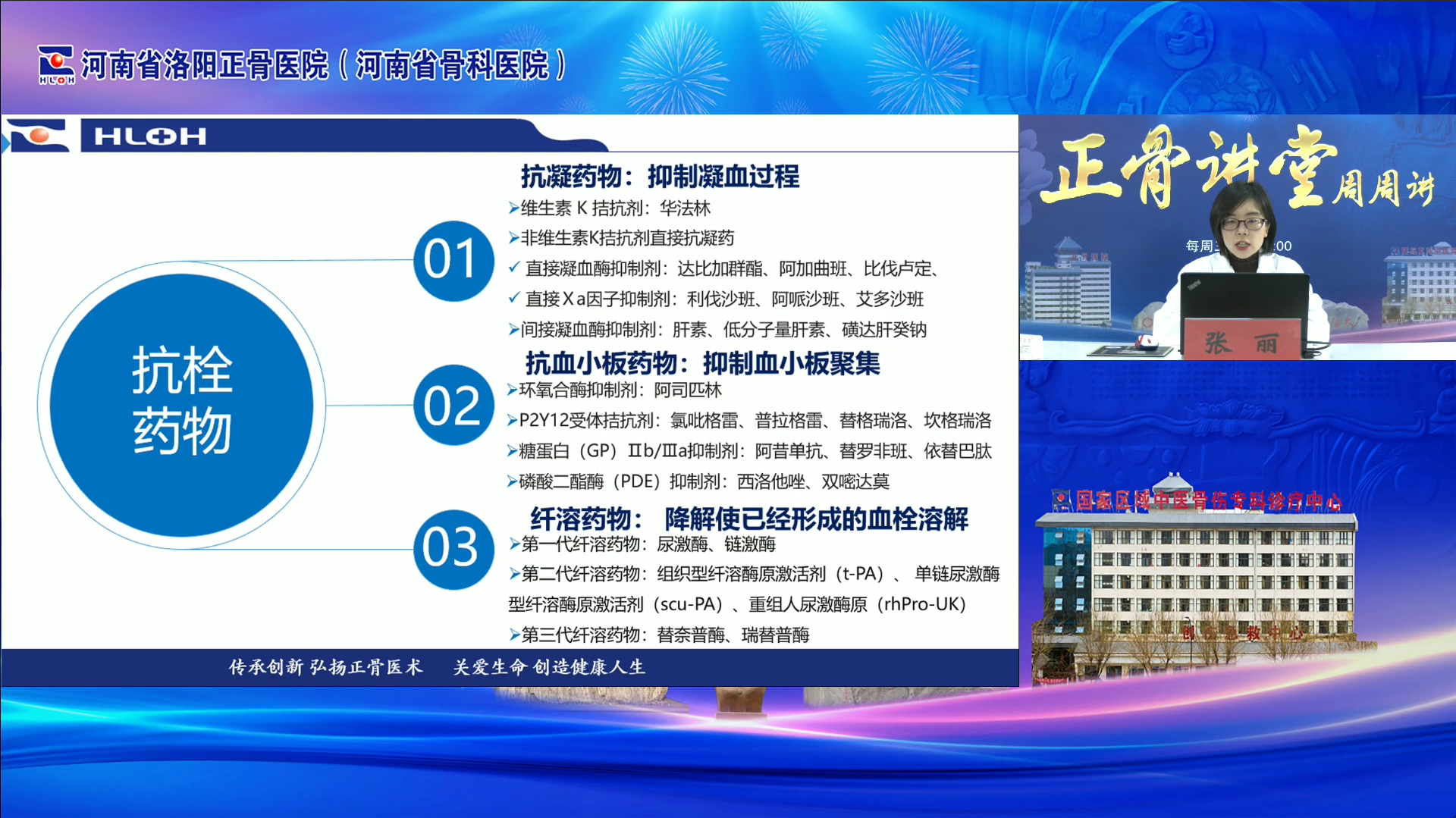 2024年3月13日,“正骨讲堂周周讲”【药师说药 守护健康】主题月第二期直播授课顺利开展。本期讲堂邀请我院临床药师张丽为大家分享骨科围手术期抗栓药物的管理。