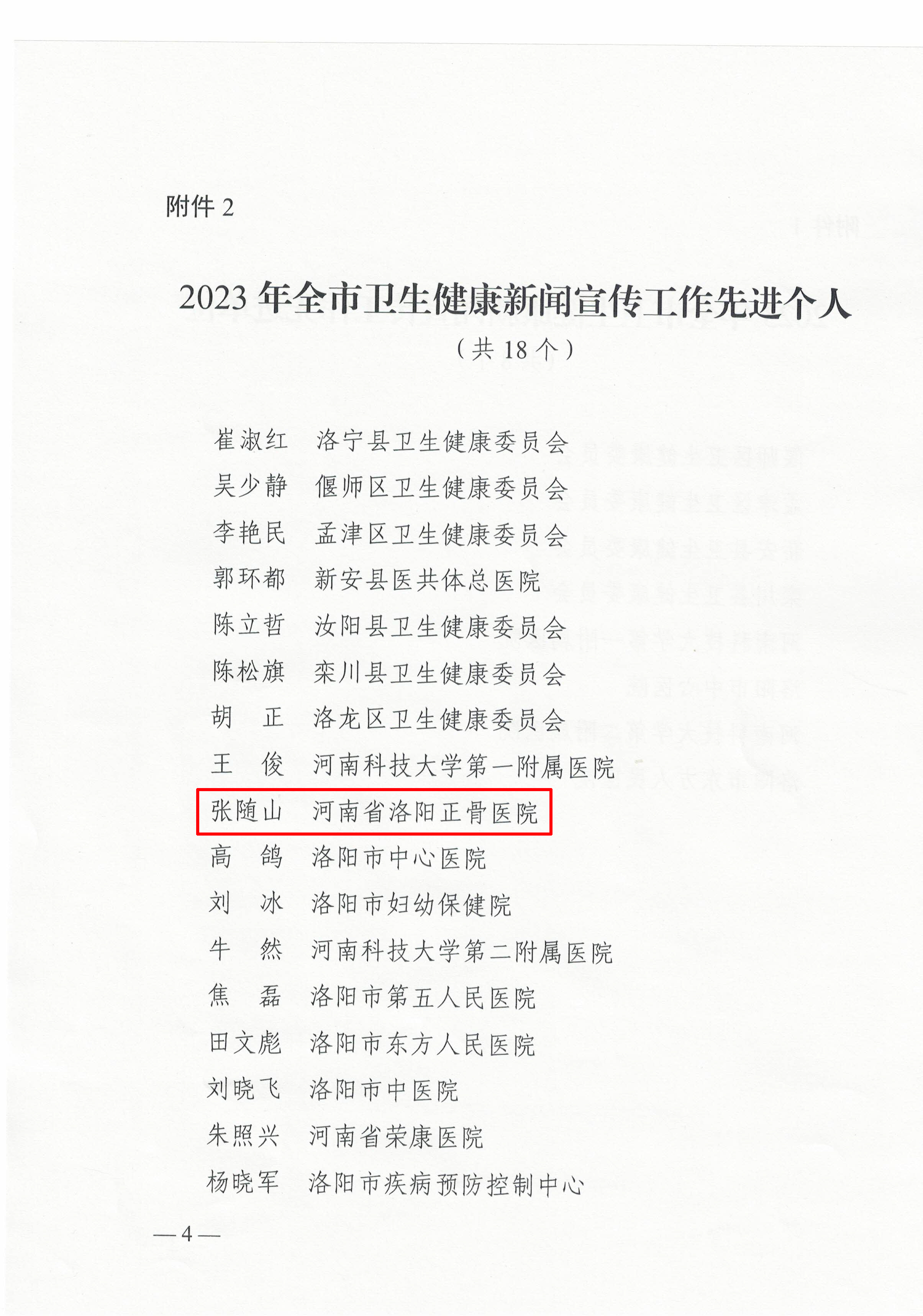 其中,我院荣获2023年全市新媒体创新传播工作先进单位;张随山同志荣获2023年全市卫生健康新闻宣传工作先进个人;胡明昊同志荣获2023年全市新媒体创新传播工作先进个人;张可乐同志荣获2023年全市卫生健康优秀科普工作者。