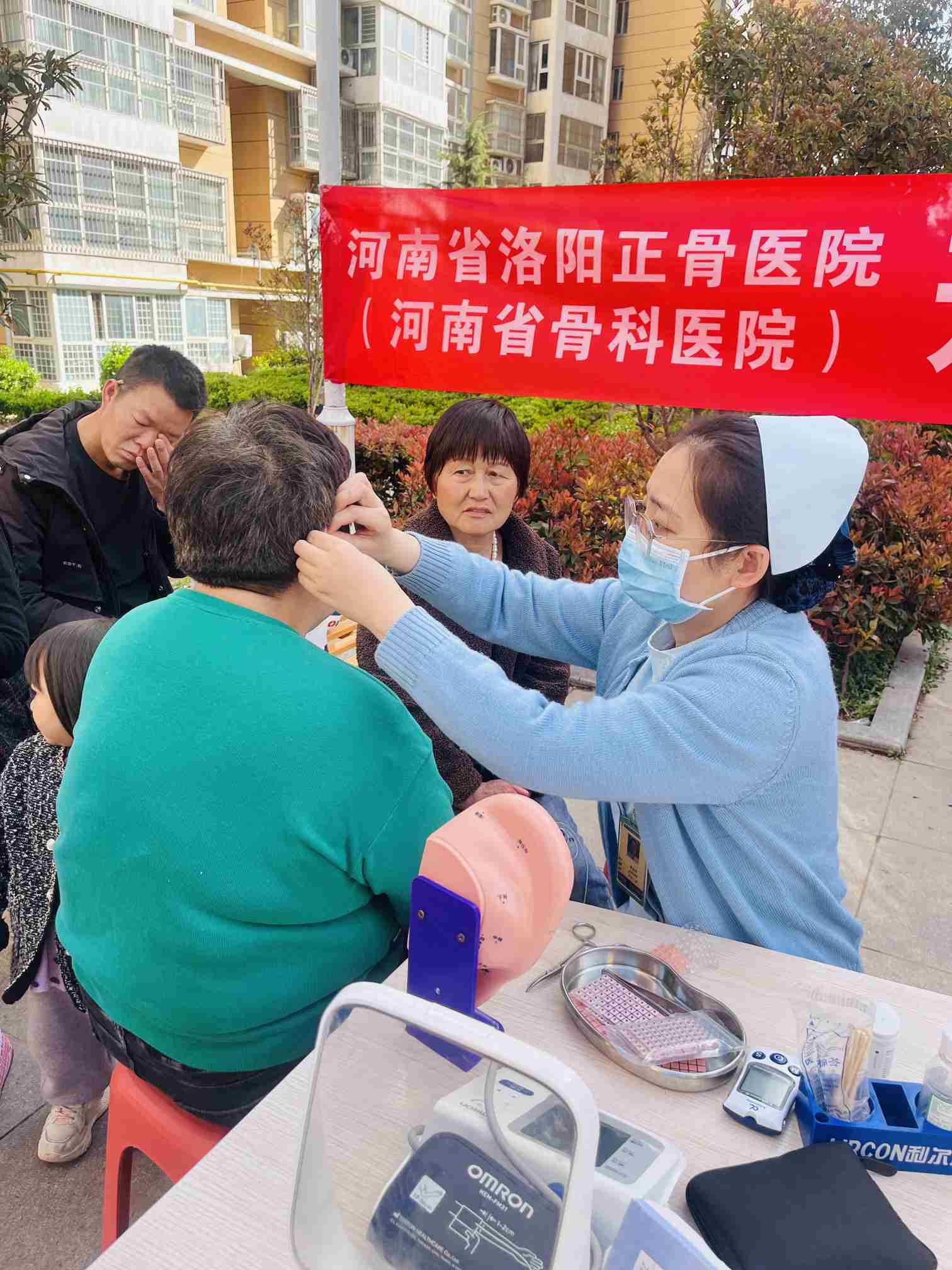刚一就位,罗姣医师和张佳佳护士的前面就排满了来检查的居民。他们或因为工作、或因为带娃等,身体出现各种不适,而又无法及时到医院就诊,听说开元门诊部再次到小区开展义诊活动,大家都十分高兴。