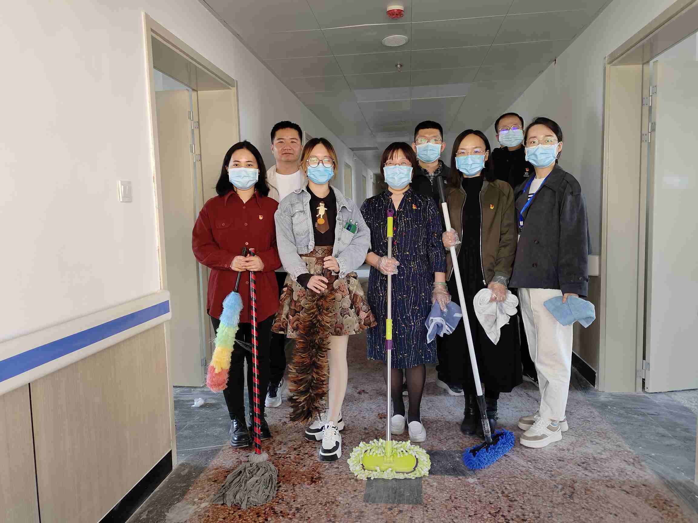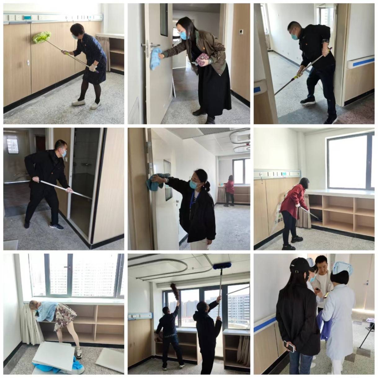 在1号楼11楼,党员同志们分工有序,协同作业,各负其责,不嫌脏累,与后勤保洁人员一同投入到打扫卫生的行列,为病区的顺利搬迁贡献自己的微薄之力。