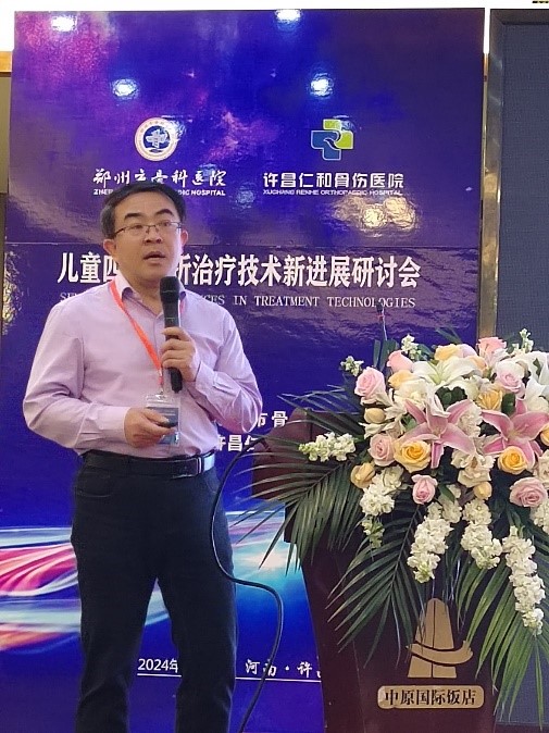 为加强学术交流,持续提升小儿骨科学术水平,更新与拓展小儿骨科新知识、新技术,推动河南地区小儿骨科水平稳步、健康、快速发展,搭建小儿骨科医务人员相互交流平台,提高河南地区儿童四肢骨折的诊治能力,2024年4月13日由郑州市骨科医院主办、许昌仁和骨伤医院承办的“儿童四肢骨折治疗技术新进展研讨会”在许昌市中原国际饭店举办,我院郑州院区小儿骨科丁幸坡主任、洛阳院区手法正骨科薛继强主治医师应邀参会并授课。