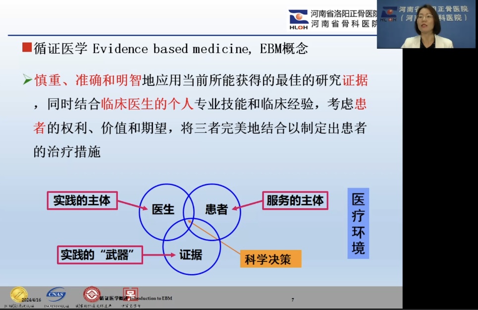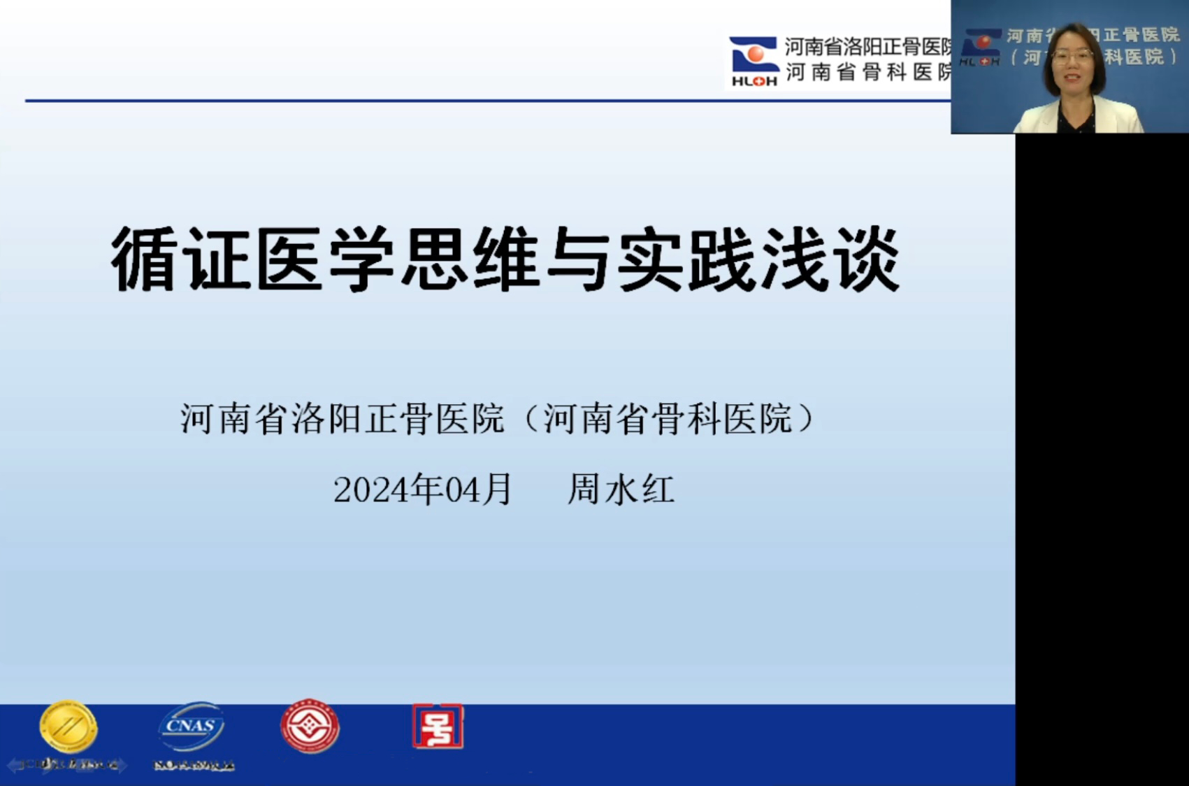 周水红主任以《循证医学思维与实践浅谈》为题,围绕循证医学基础知识简介、循证思维(循证医学实践过程/步骤及方法)、循证医学与临床研究(实践)、实践循证医学时的注意事项、我院循证医学实践简介五部分展开演讲。周主任不但介绍了循证医学基础知识,还着重讲述了循证思维及循证医学的实践过程:提出问题、查询证据、评价证据、应用证据、后效评价。她指出:循证医学,是“循”,不是“医”,不直接研究具体的疾病,而是提供一套临床研究和实践的思路和方法,对疾病诊疗、照护做出最佳决策的一种思维方式。