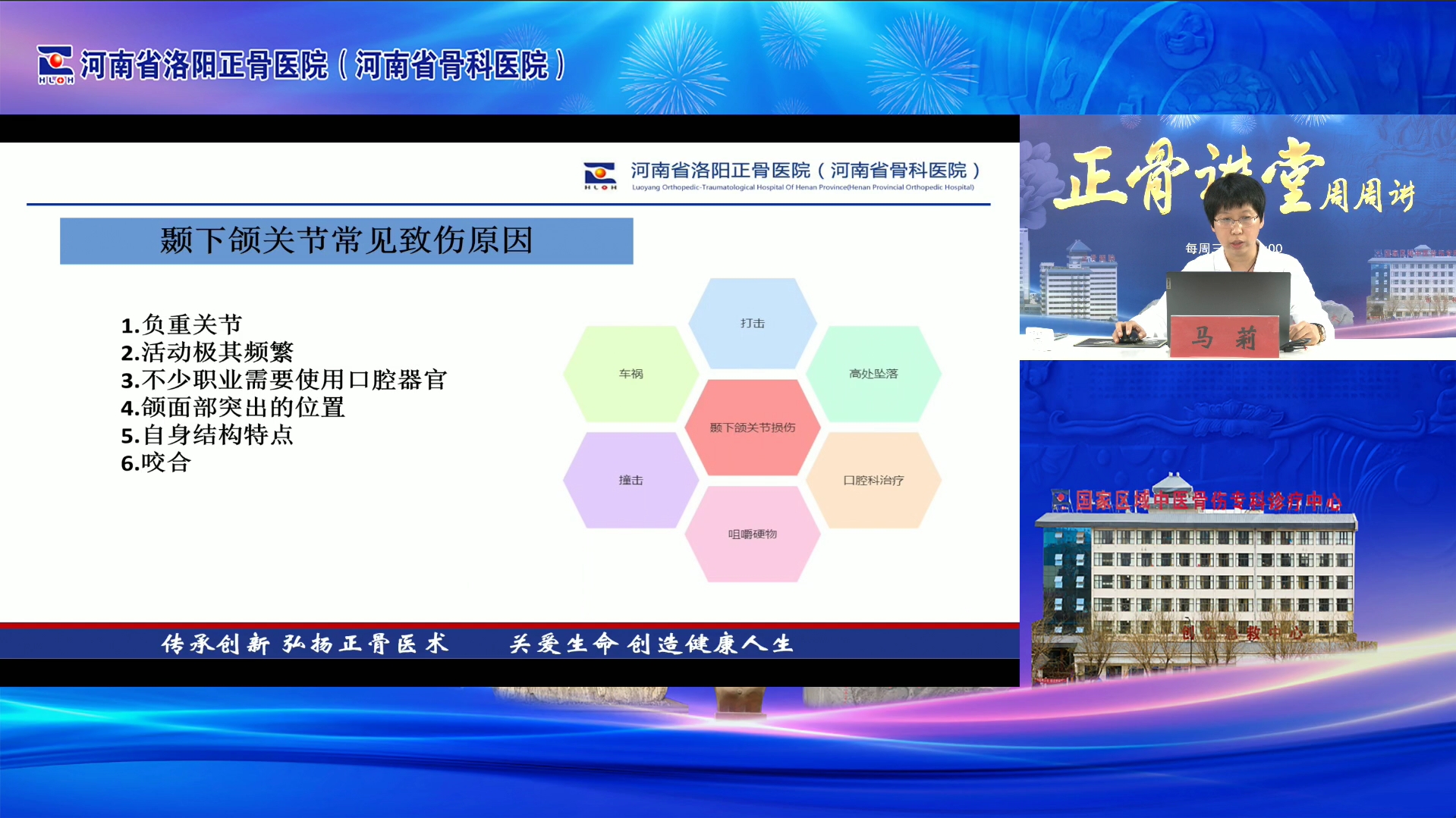 2024年4月17日,“正骨讲堂周周讲”【颌韵新声】主题月第三期直播授课顺利开展。本期讲堂邀请我院整形外科(颌面骨科)副主任医师马莉为大家分享颞下颌关节创伤的诊断与治疗。