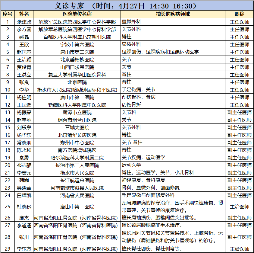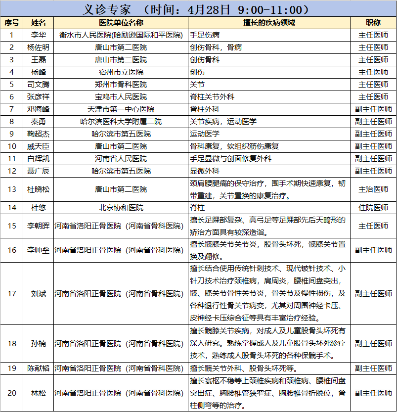 来自全国14个省(自治区、直辖市)、20个地市的44位专家教授参与义诊活动,义诊专家团队专业主要涵盖创伤、关节、运动医学、脊柱、疼痛、手外、足踝、小儿、矫形、康复等,范围广、病种多,让河南百姓足不出省就能享受国内一流专家的骨科诊疗服务,减轻骨病痛苦。