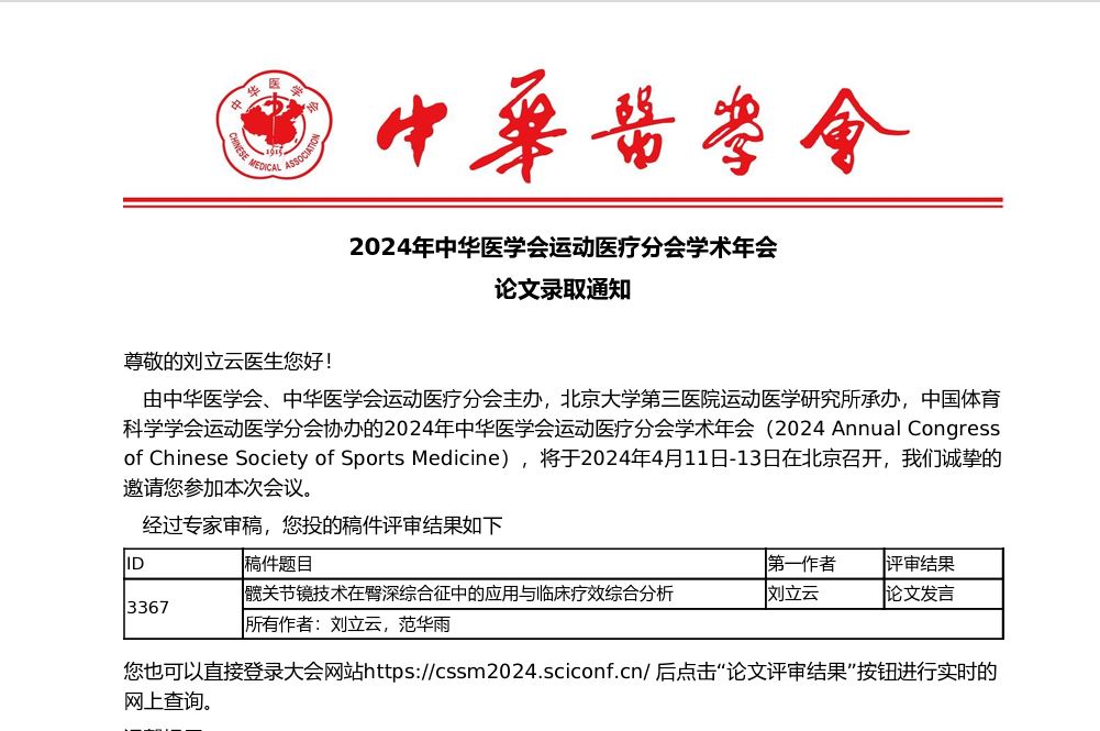近日,我院郑州院区髋关节外科刘立云医师团队,受邀出席在北京召开的中华医学会运动医学年会,并做主旨《髋关节镜技术在臀深综合征治疗中的应用和临床疗效分析》大会发言,展示了我院髋关节镜技术在髋关节疾病治疗领域的创新成果。