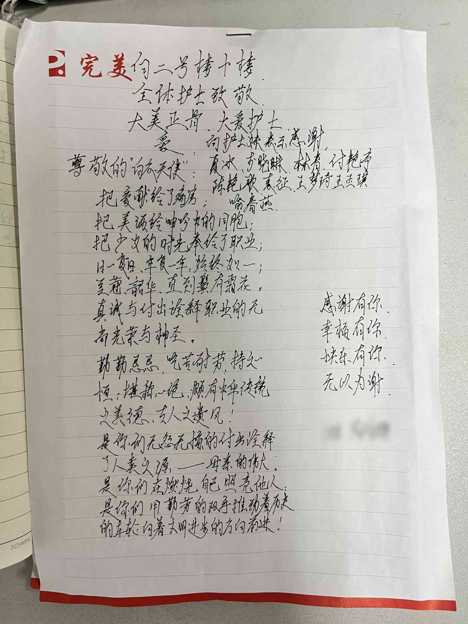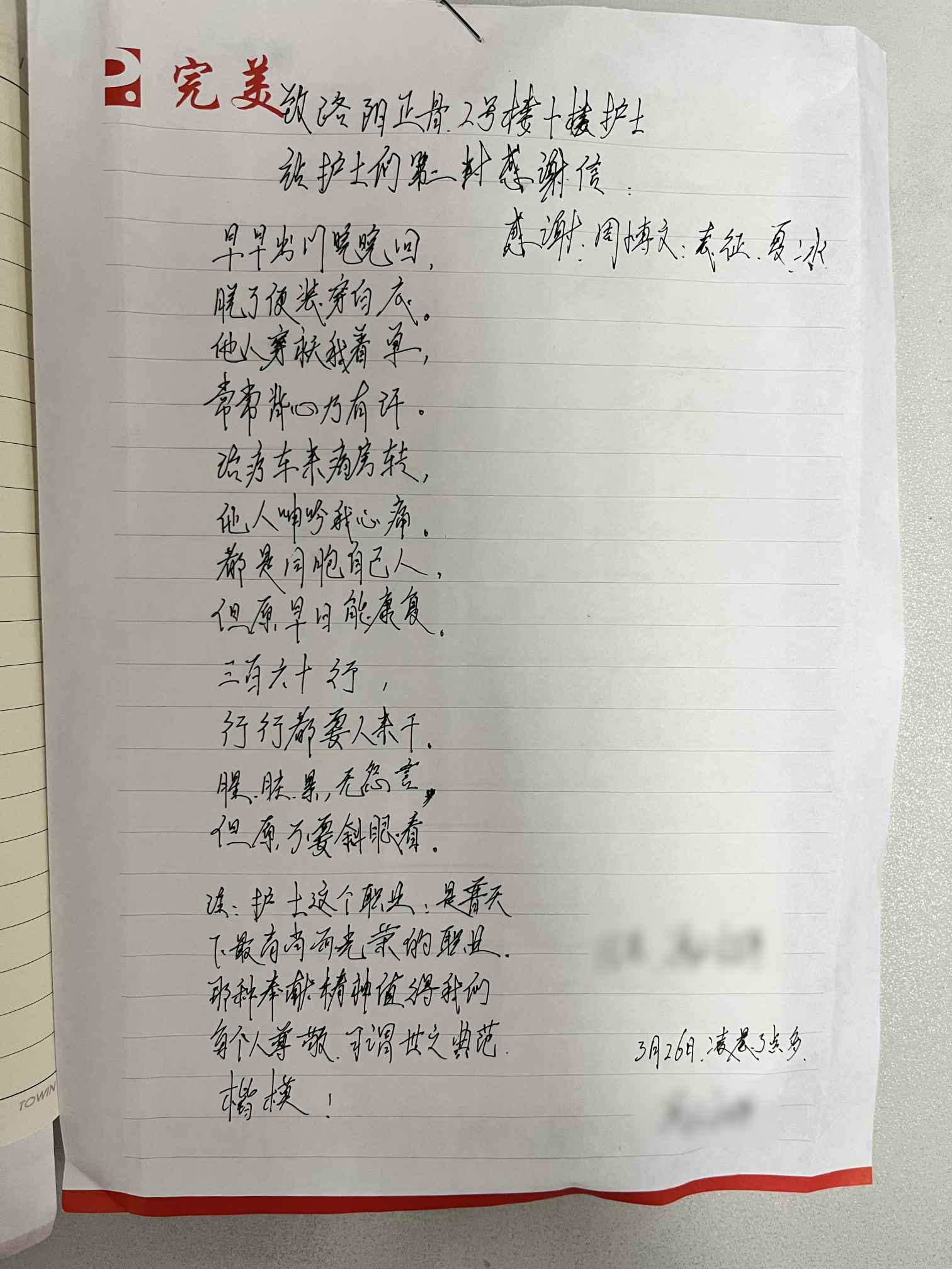 纸短情长,字字暖心。马先生的感谢信既是对医务人员的赞美,更是对医务人员的鼓舞。我院医护人员始终以实际行动诠释“以减轻患者病痛为己任,以患者满意为目标”的宗旨,在今后的工作中我们会加倍努力,以更加优质的服务回馈患者的信任和支持。