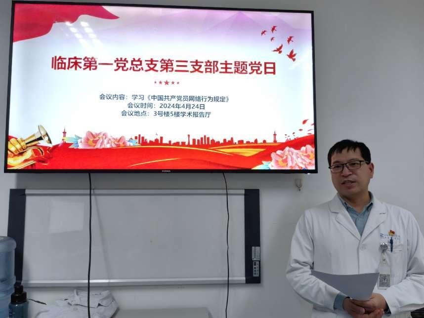 为贯彻落实上级党委通知要求,进一步规范党员网络行为,积极营造健康向上、风清气正的网络环境,4月24日下午临床第一党总支第三支部以“传播网络正能量,共创美好新时代”为主题进行了主题党日活动。