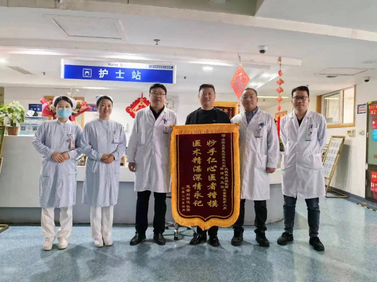 4月22日,我院脊柱外三科收到了一面由刘先生亲手赠送的锦旗,旗面上“妙手仁心医者楷模,医术精湛深情永记”两行大字表达了刘先生对脊柱外三科陈海龙主任和马俊杰医生及全体医护人员的深深敬意和感激。