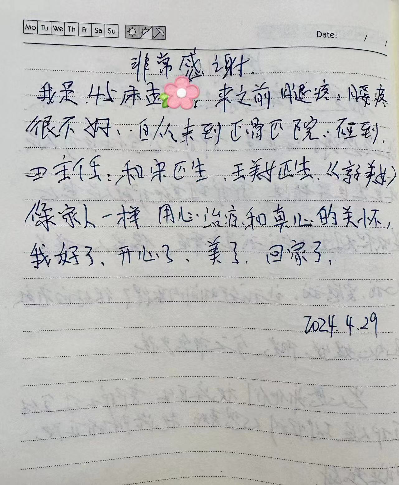 经过20天的精心治疗,孟女士的膝关节和腰部疼痛明显减轻。她能够自如地行走、弯腰,重新享受生活的乐趣。在4月29日出院之际,孟女士激动地说:“感谢你们,治疗效果真好!我出院了,真开心!”为了表达对医护人员的感激之情,孟女士亲手写下了一封感谢信。信中,她详细描述了自己的病情和治疗过程,以及医护人员对她的关心和照顾。她写道:“骨关节病三科的医护人员像家人一样,用心治疗和真心的关怀。”