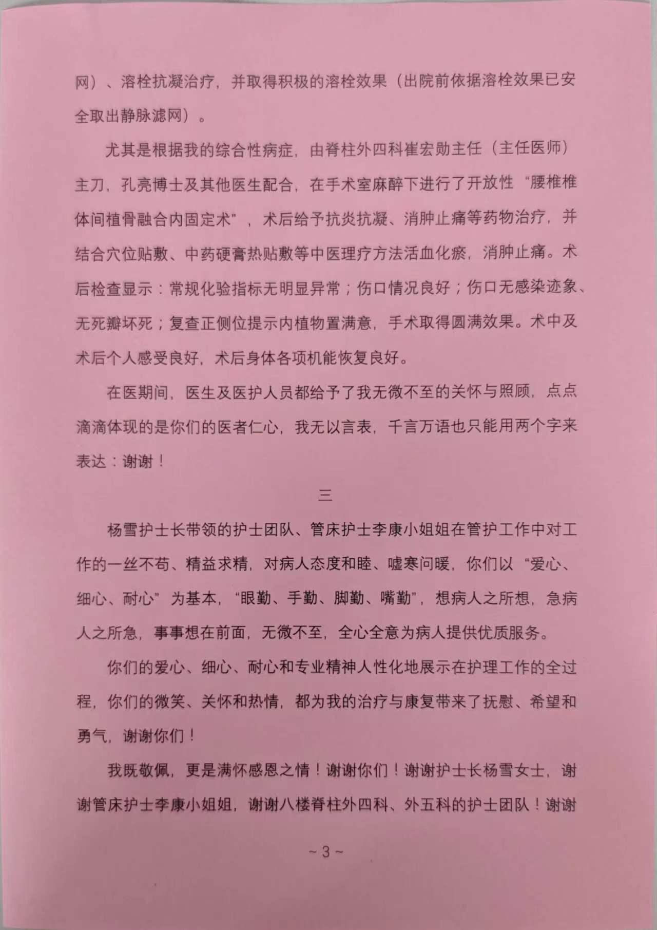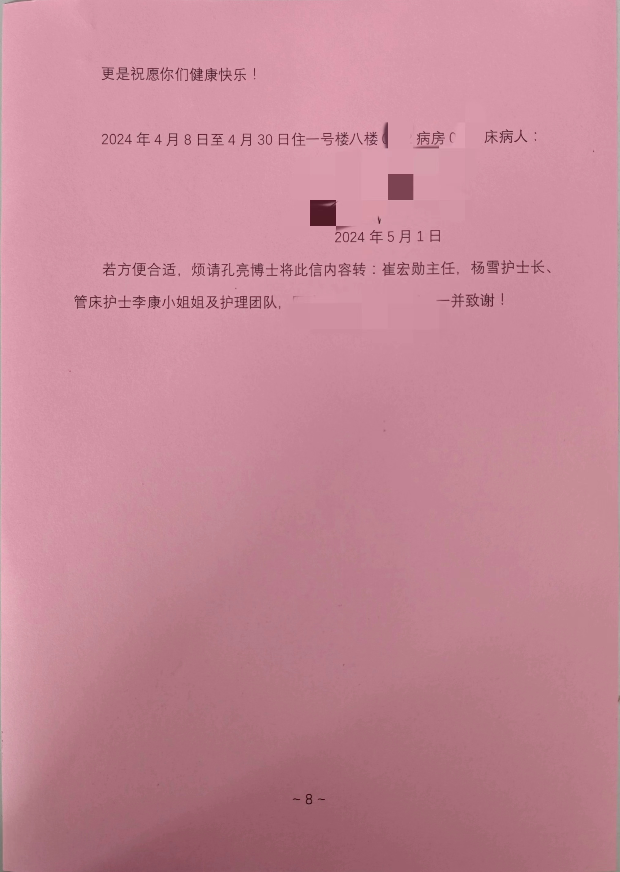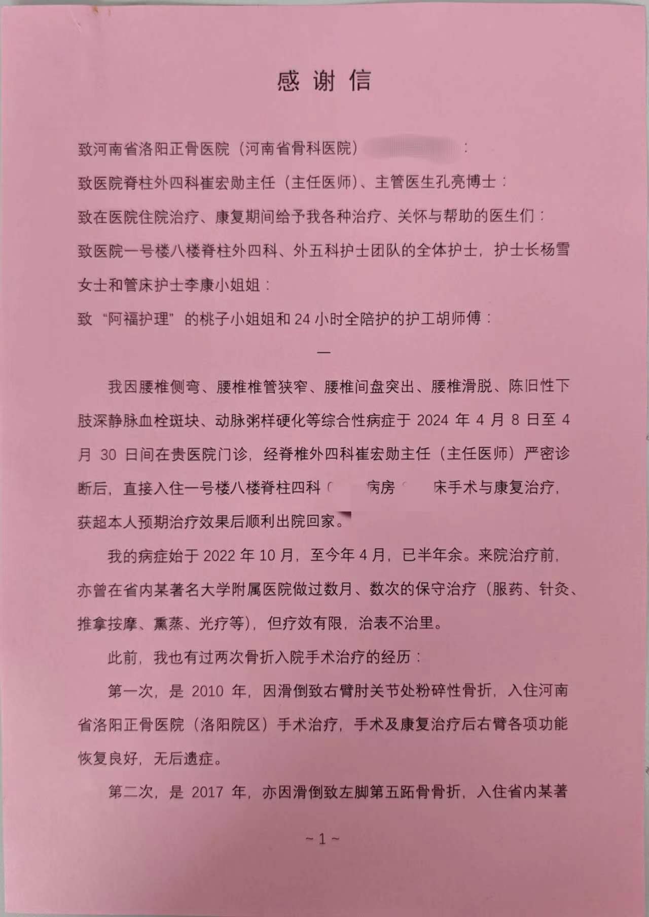 2024年5月3日,我院郑州院区脊柱外四科收到一封长达八页的感谢信,这是一位出院不久的患者表达对脊柱外四科的医生、护士和护工的赞誉与感激之情。 该患者因腰椎侧弯、腰椎椎管狭窄、腰椎间盘突出、腰椎滑脱等综合性病症,在我院郑州院区接受了腰椎椎体间植骨融合内固定术。术后患者的身体各项机能逐渐恢复良好,治疗效果超出预期。