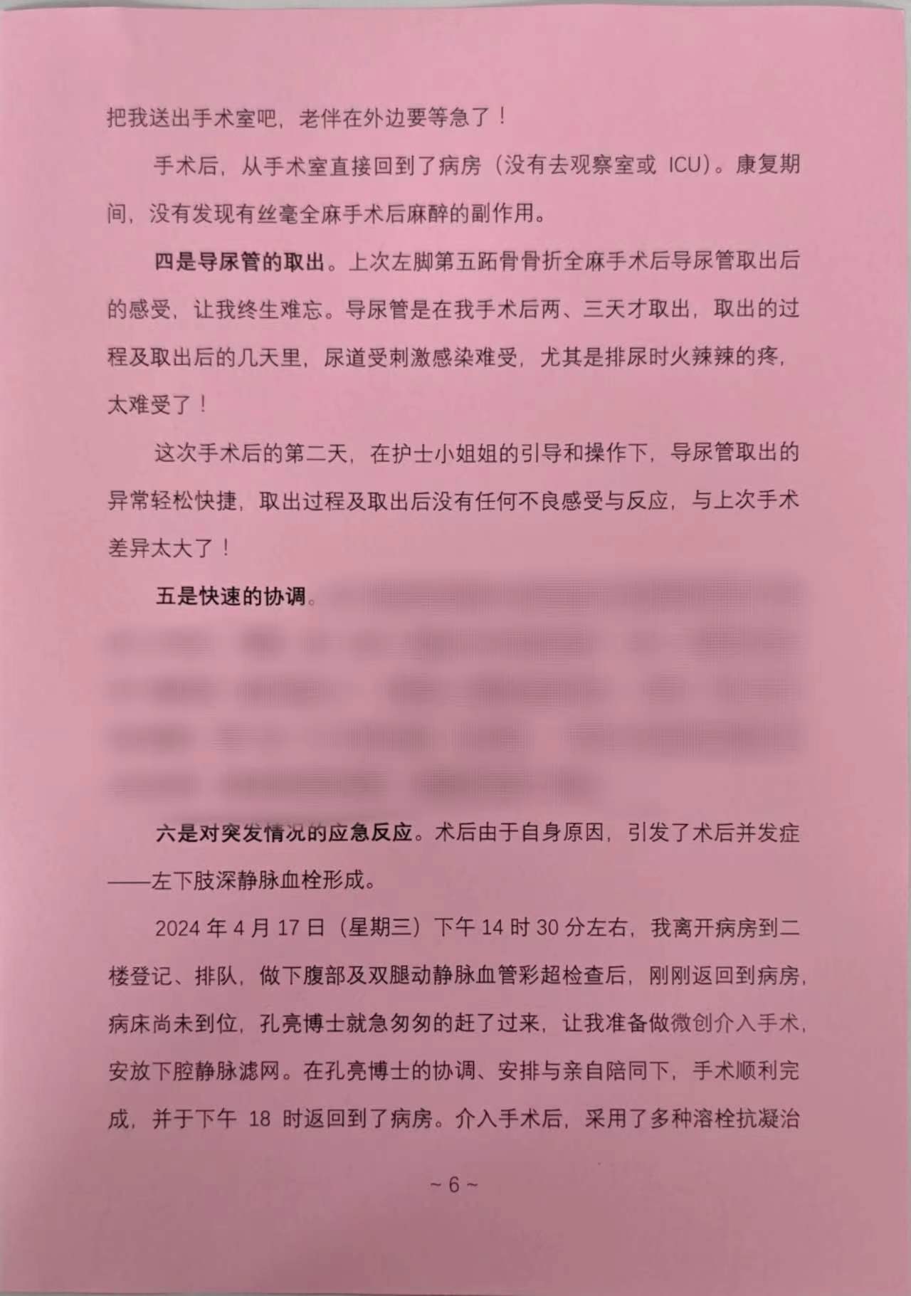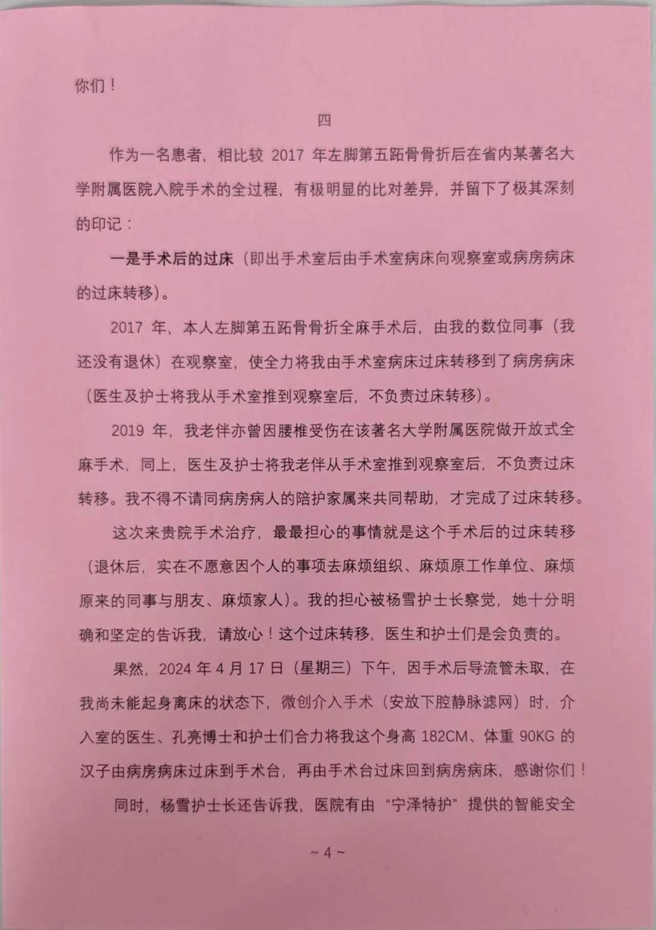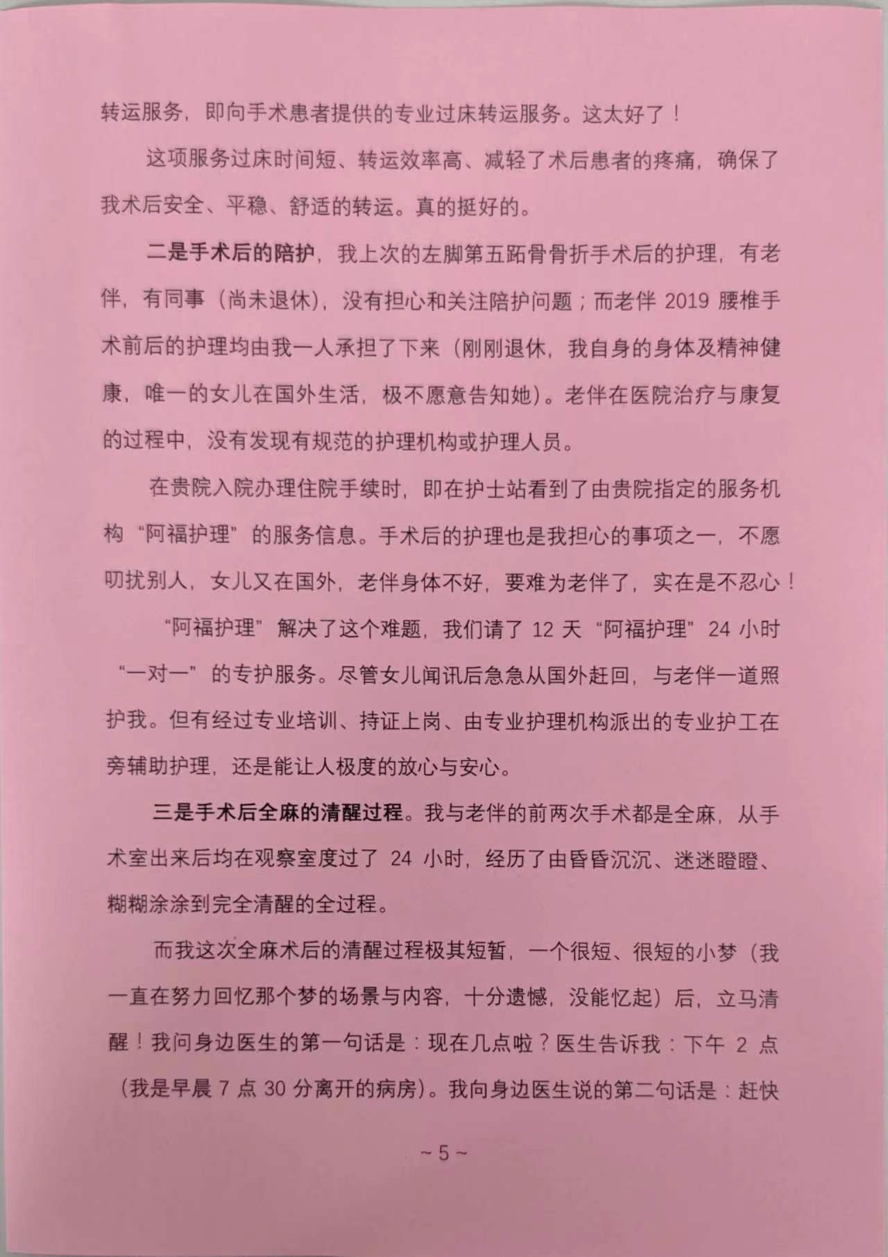 2024年5月3日,我院郑州院区脊柱外四科收到一封长达八页的感谢信,这是一位出院不久的患者表达对脊柱外四科的医生、护士和护工的赞誉与感激之情。 该患者因腰椎侧弯、腰椎椎管狭窄、腰椎间盘突出、腰椎滑脱等综合性病症,在我院郑州院区接受了腰椎椎体间植骨融合内固定术。术后患者的身体各项机能逐渐恢复良好,治疗效果超出预期。