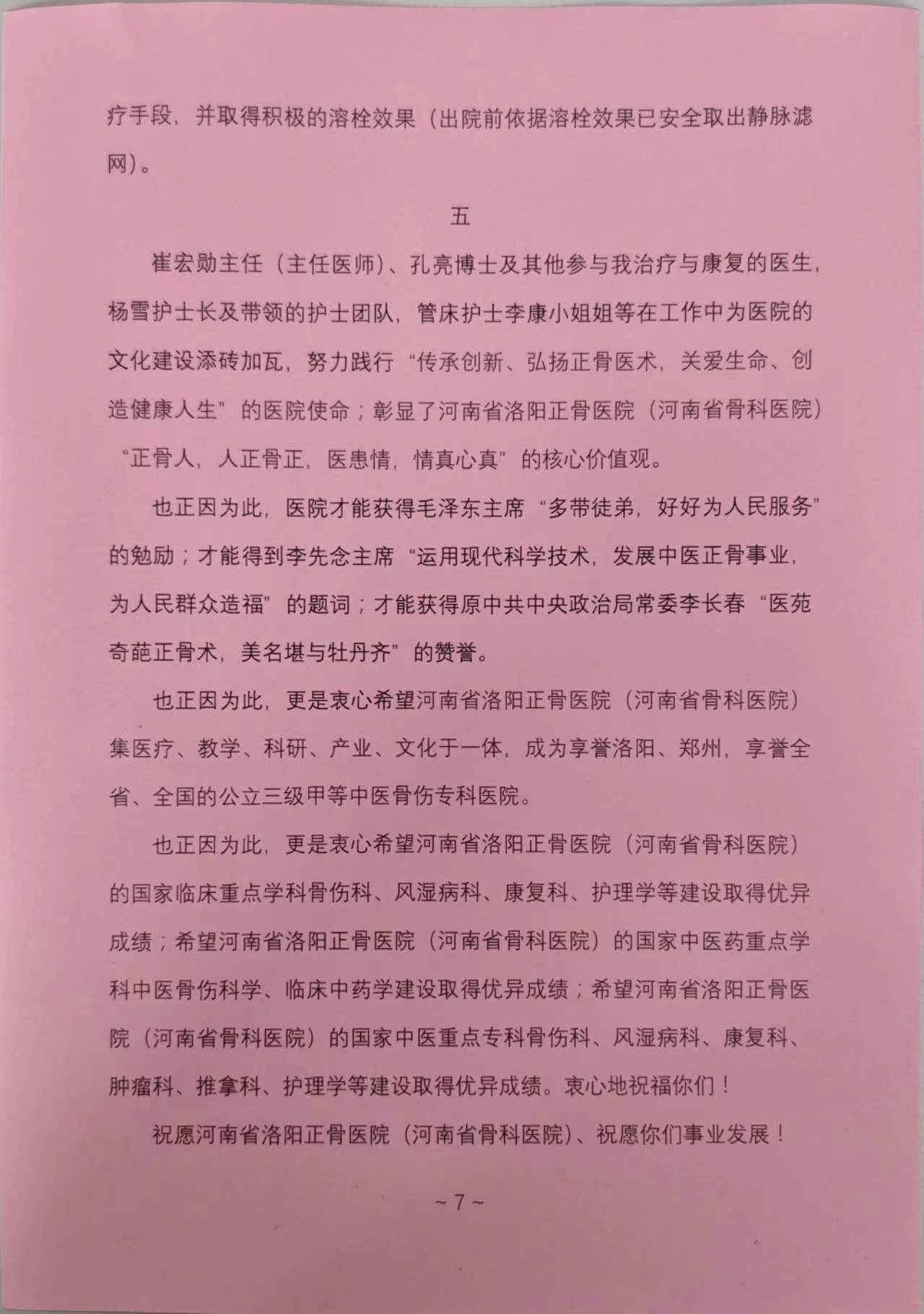 在住院治疗期间,患者充分感受到医生和护士的关心和专业精神,让患者感到温暖和勇气。患者在感谢信中表示,这次选择河南省洛阳正骨医院治疗是正确的决定。