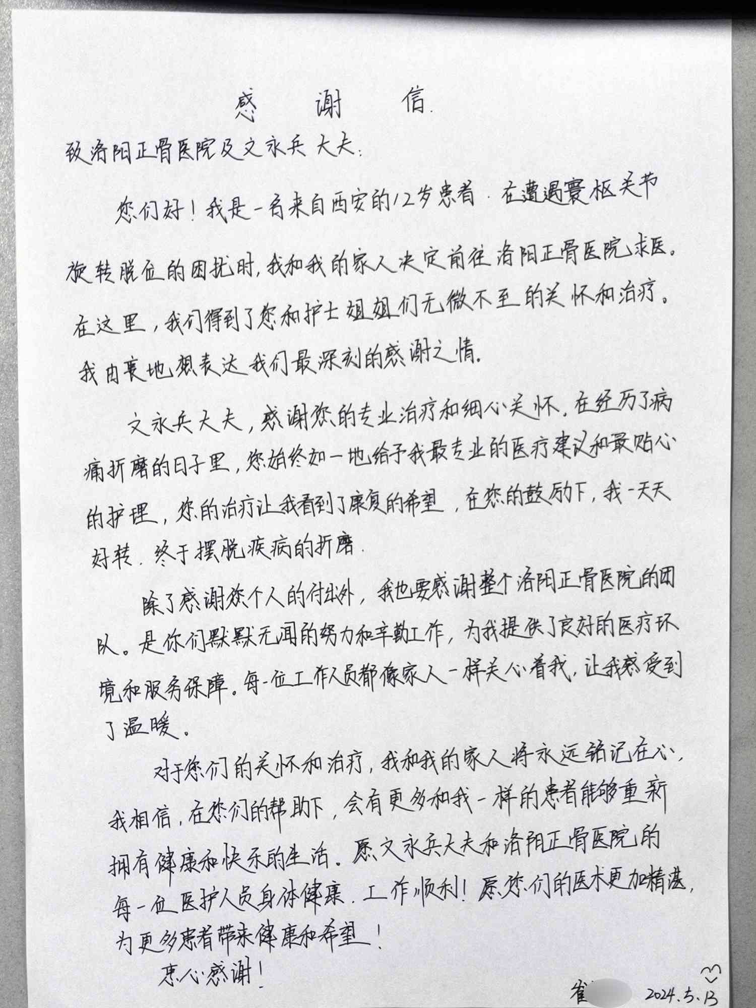 在住院期间,文永兵医师与护士们的专业治疗和细心关怀给小崔留下了深刻印象。出院前一天,小崔特意手写一封感谢信,表达自己的感激之情。