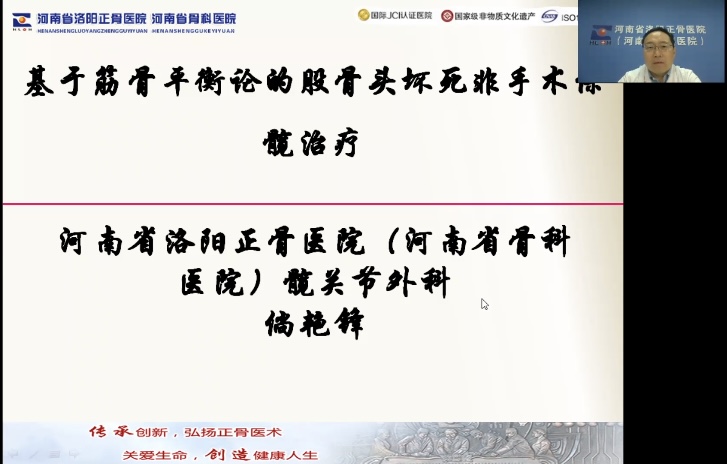 倘艳锋结合自己亲身临床实践,通过多个视频向大家展示了我院髋关节外科诊疗中心在保守治疗股骨头坏死方面独到的治疗方法及显著的治疗效果,同时,他指出,股骨头坏死非手术保髋治疗贵在“三早”(早发现、早诊断、早治疗);特别强调了“动静结合”的重要性。