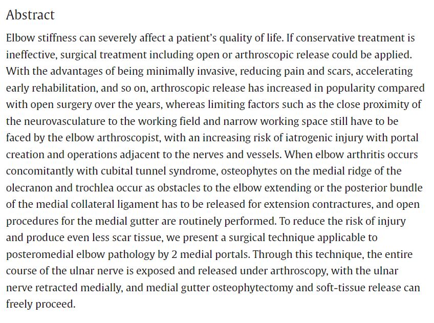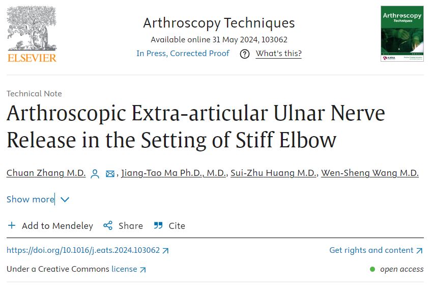 2024年5月,我院郑州院区肩肘外二科张川团队原创文章《Arthroscopic Extra-articular Ulnar Nerve Release in the Setting of Stiff Elbow(全关节镜下尺神经松解保护在肘关节僵硬松解中的应用)》在《Arthroscopy Techniques(关节镜技术)》杂志在线发表。该杂志为Elsevier(爱思唯尔)出版集团旗下SCI收录期刊,关节镜技术领域权威杂志,运动医学专业顶级期刊《Arthroscopy(关节镜)》的技术专刊,以报道全球关节镜领域创新性技术内容为主。