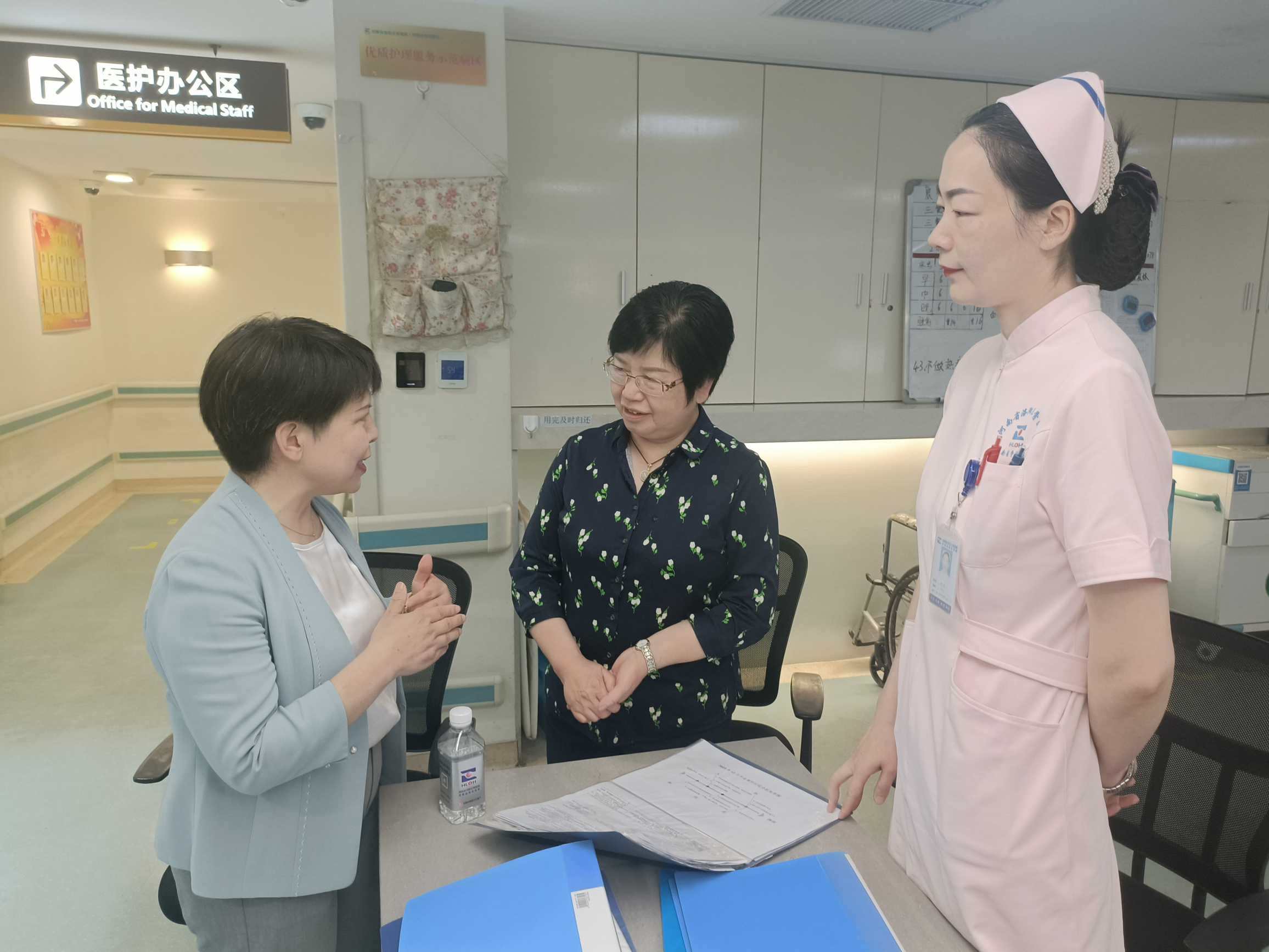 大会前夕,在郑州院区护理部主任吴松梅引导下,胡三莲主任到我院郑州院区参观指导。在膝关节外一、二科护理单元,吴松梅主任和赵小菲护士长向胡三莲主任汇报了现阶段我院护理管理、服务、质控等方案实施细则,胡主任对我院护理工作表示赞赏,并对护理创新等工作给予指导。