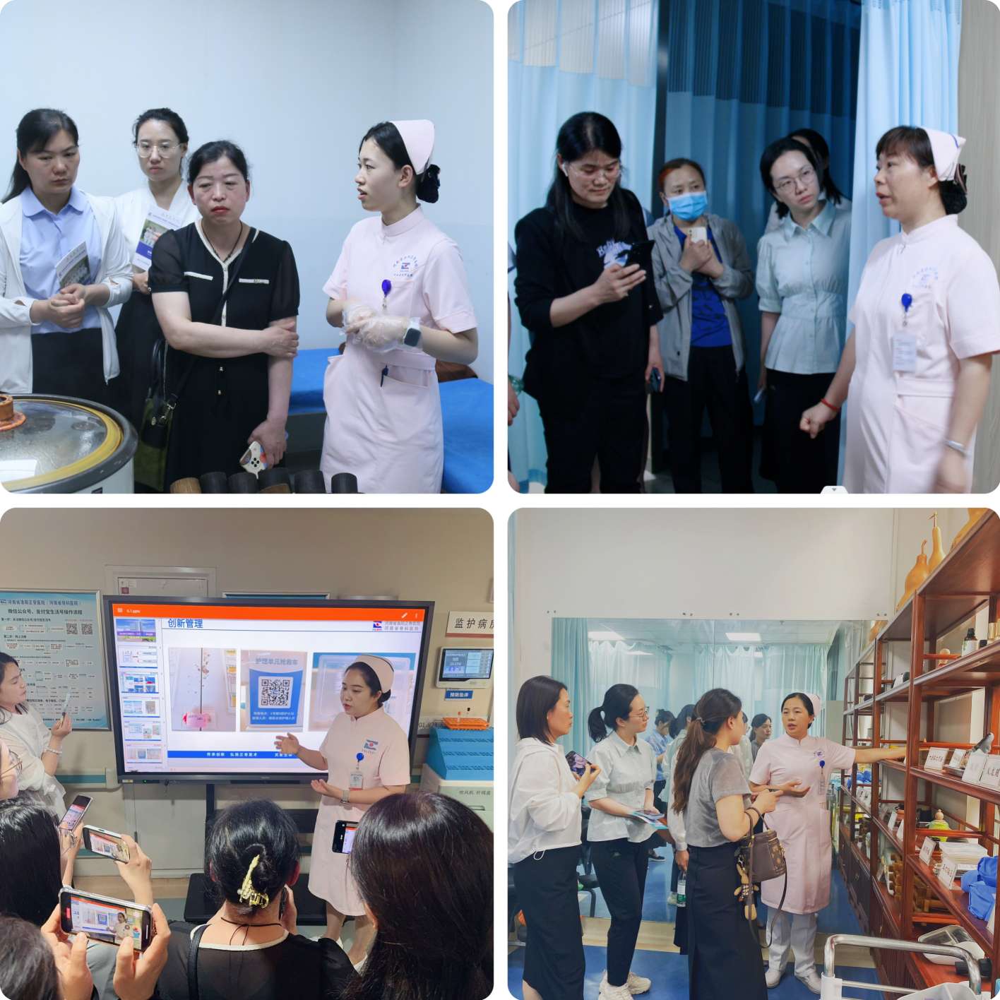 接着由供应室护士长刘仁飞带队来到骨病科(骨坏死科),科室特色的药物罐、运动处方以及艾箱灸的改版升级获得同行人员的一致好评。传统治疗中心护士长齐然对现代化熏洗中心合理分区、便民采购二维码的使用进行讲解。脊柱外三科陈璐璐护士长对科室护理创新管理,护理人文关怀相关知识进行多方面,全方位的阐述,并对参观者的问题进行一一解答。中医特色护理门诊护士长王丹丹向大家展示了虎符铜砭刮痧、温通刮痧疗法、火龙罐等中医技术操作在临床的应用,并表示中医护理的发展需要传承和创新,极大的激发了同行人员学习中医,发扬中医的饱满情绪。