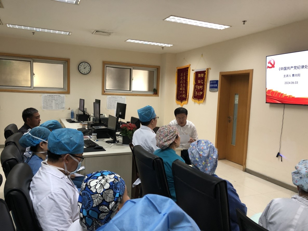 2024年6月3日,临床二总支四支部在重症医学科办公室召开了6月份主题党日活动暨专题党课。会议由于国军同志主持,支部全体党员参加了会议。会议由副院长曹向阳同志讲专题党课:《中国共产党纪律处分条例》解读之二——为新征程推进全面从严治党提供坚强的纪律保障。