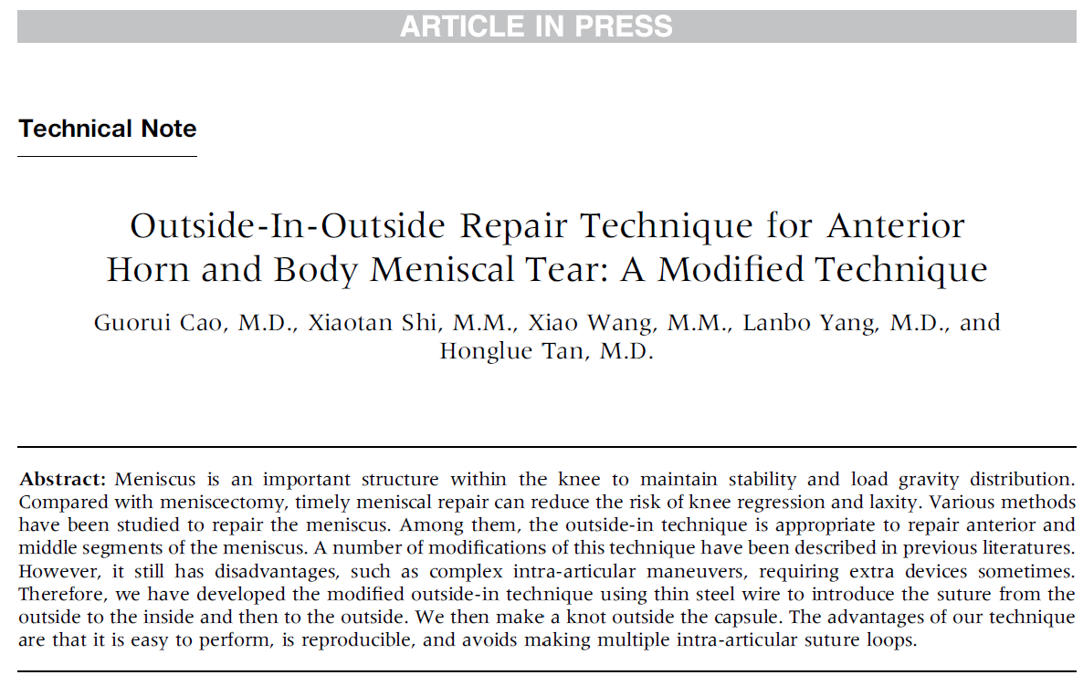 近日,我院东花坛院区膝关节外四科谭红略主任团队原创文章《Outside-In-Outside Repair Technique for Anterior Horn and Body Meniscal Tear: A Modified Technique(外-内-外缝合技术治疗半月板前角和体部损伤)》于2024年6月在《Arthroscopy Techniques(关节镜技术)》杂志在线发表,其中曹国瑞医师为论文第一作者,谭红略主任为论文通讯作者,史小涛医师、王啸医师和杨澜波主任为论文共同作者。该杂志为Elsevier(爱思唯尔)出版集团旗下SCI收录期刊,关节镜技术领域权威杂志,运动医学关节镜方面顶级期刊《Arthroscopy(关节镜)》的兄弟期刊,以报道全球关节镜领域创新性技术内容为主。