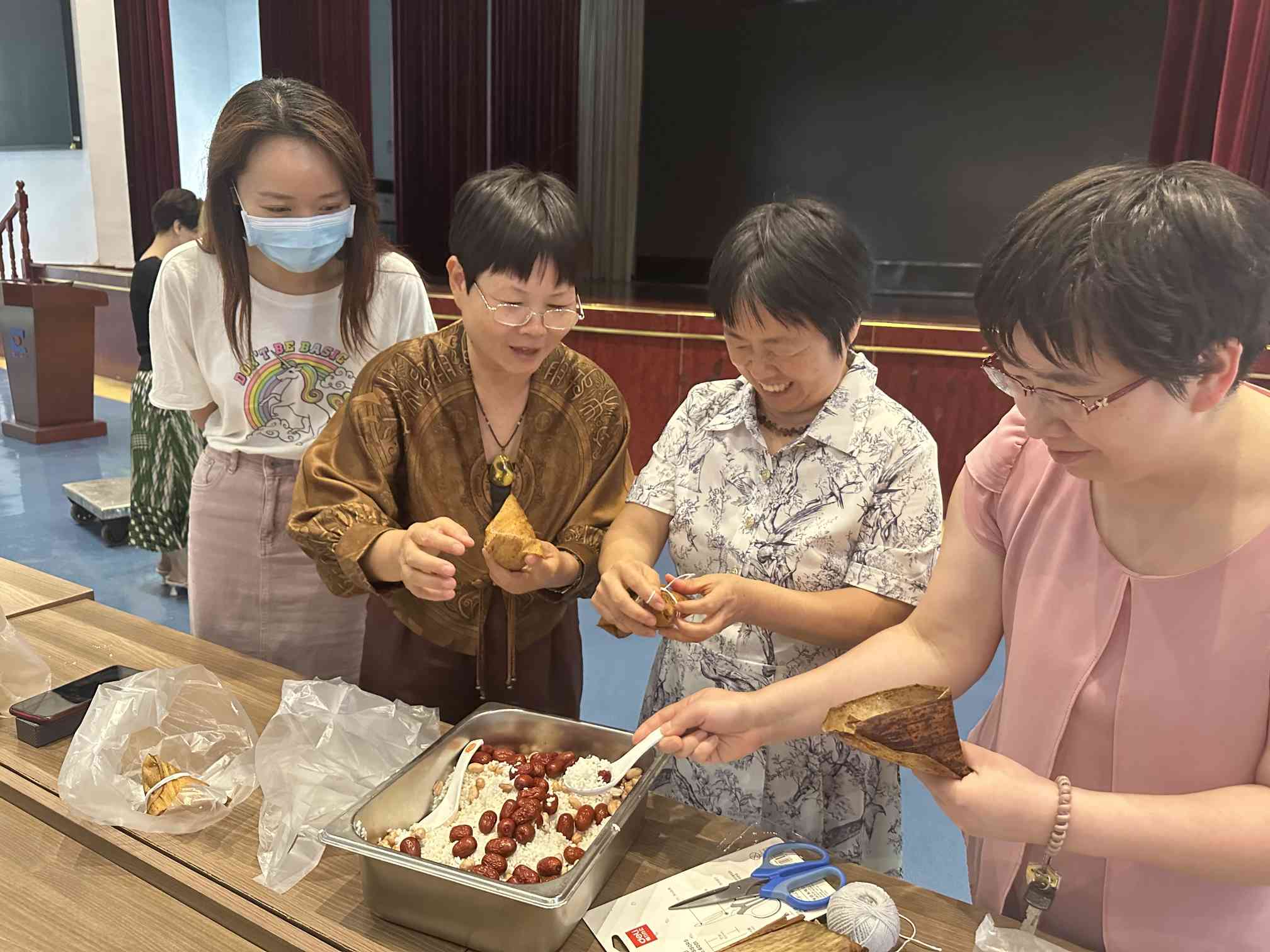 活动现场,各科室人员齐聚一堂,其乐融融地包起了各式各样的粽子。大家纷纷拿出“看家本领”,使出“十八般武艺”,裹粽叶、塞糯米、放蜜枣、绑粽绳,动作行云流水、一气呵成,粽叶在大家手中上下翻飞,不一会儿就包好了一个粽子。有的则是新手,在包粽子的老手指导下,笨拙的将粽子包好,虽然包的不是很完美,但看着自己动手包了粽子,大家心里都很开心,尽情享受自己的劳动成果。
