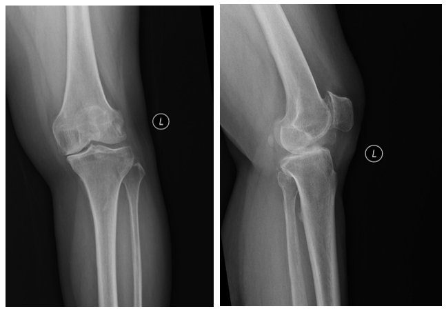 患者是一位57岁的女性,双膝关节疼痛3年,近3个月加重,左膝关节较为严重,无明显肿胀,膝关节内侧缘压痛阳性,髌骨研磨试验阳性,膝关节侧方应力试验、前后抽屉试验阴性。经诊断,确定为前内侧骨性关节炎,谭红略主任团队为患者制定了微创的保膝治疗方案——膝关节单髁置换术。