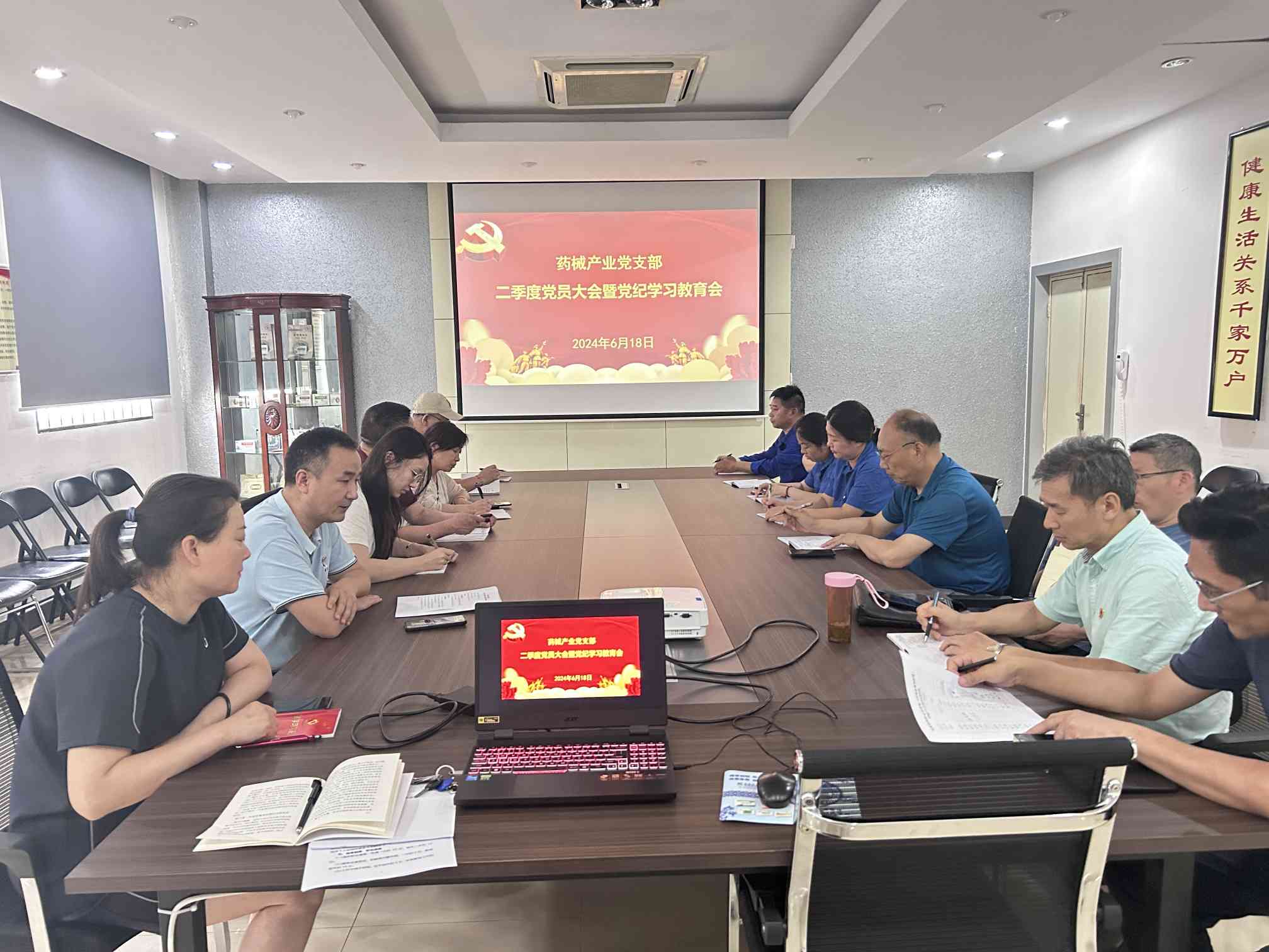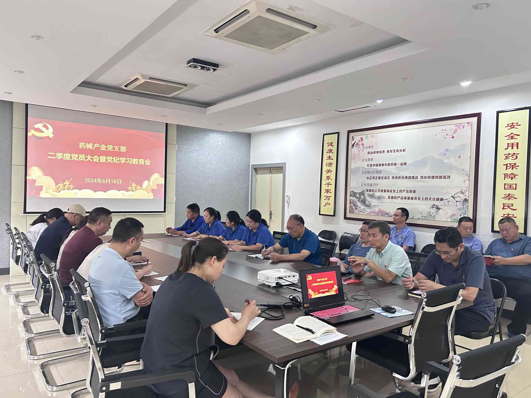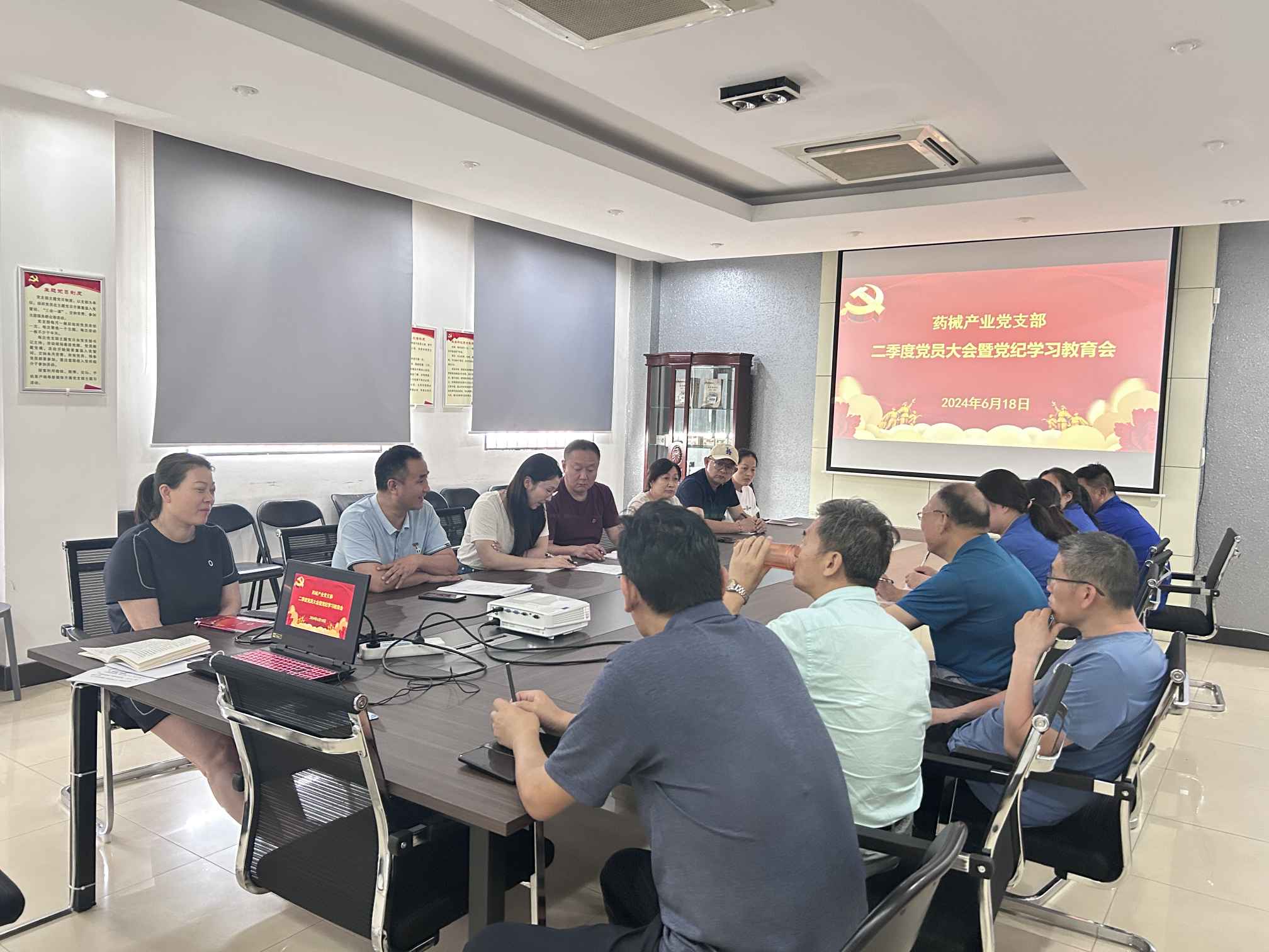 6月18日下午,为深入推进基层党纪学习教育,巩固拓展主题教育成果,药械产业党支部在洛正药业一楼会议室召开二季度党员大会,全面总结拟定阶段性党建工作,并举办“恪守清正廉洁 践行群众路线”主题党纪学习教育会。在洛20多名党员参加会议,党支部书记陈文鹏主持会议。