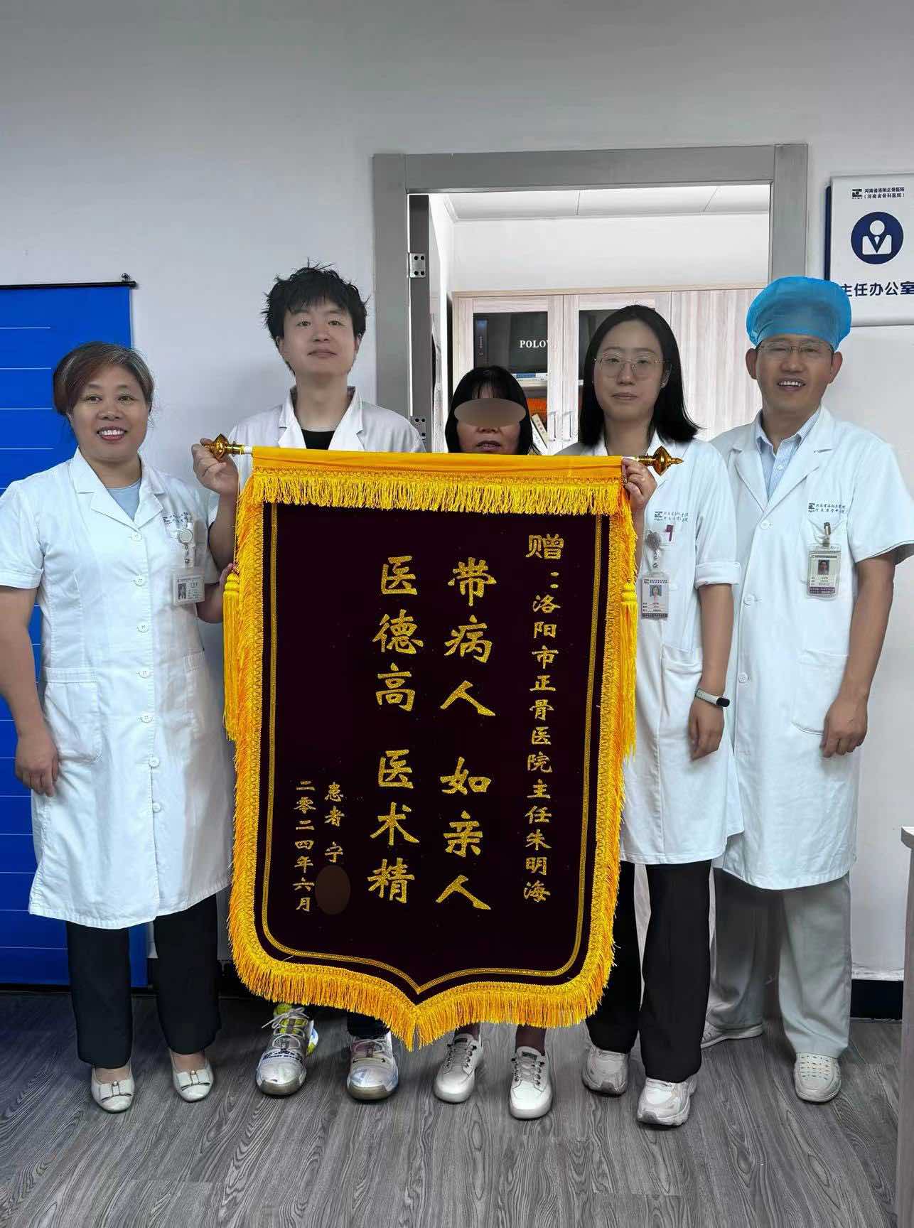 2024年6月20早,矫形骨一科像往常一样正在进行每日的早会,突然传来一阵“咚咚咚”的敲门声,随后进来一位患者家属,只见她激动的无法言语,接着拿出了一面锦旗,表示要感谢朱明海主任。朱主任认出了这位家属,很意外说道:“咱手术都还没有做,你为什么现在送啊?”