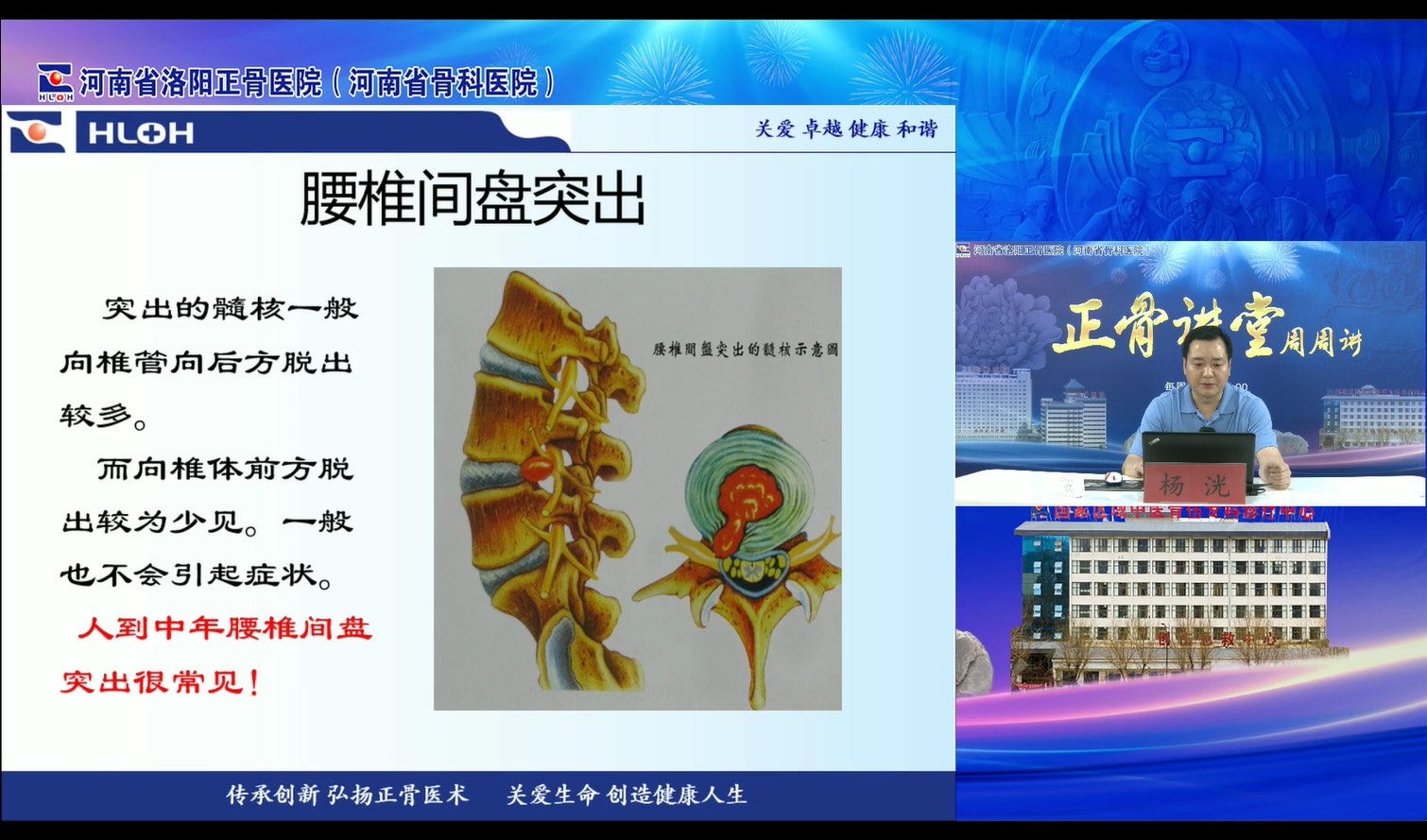 2024年6月26日,“正骨讲堂周周讲”【走进康复 相约健康】主题月第四期直播授课顺利开展。本期讲堂邀请我院康复院区管委会副主任杨洸为大家分享腰椎间盘突出症治疗探秘。