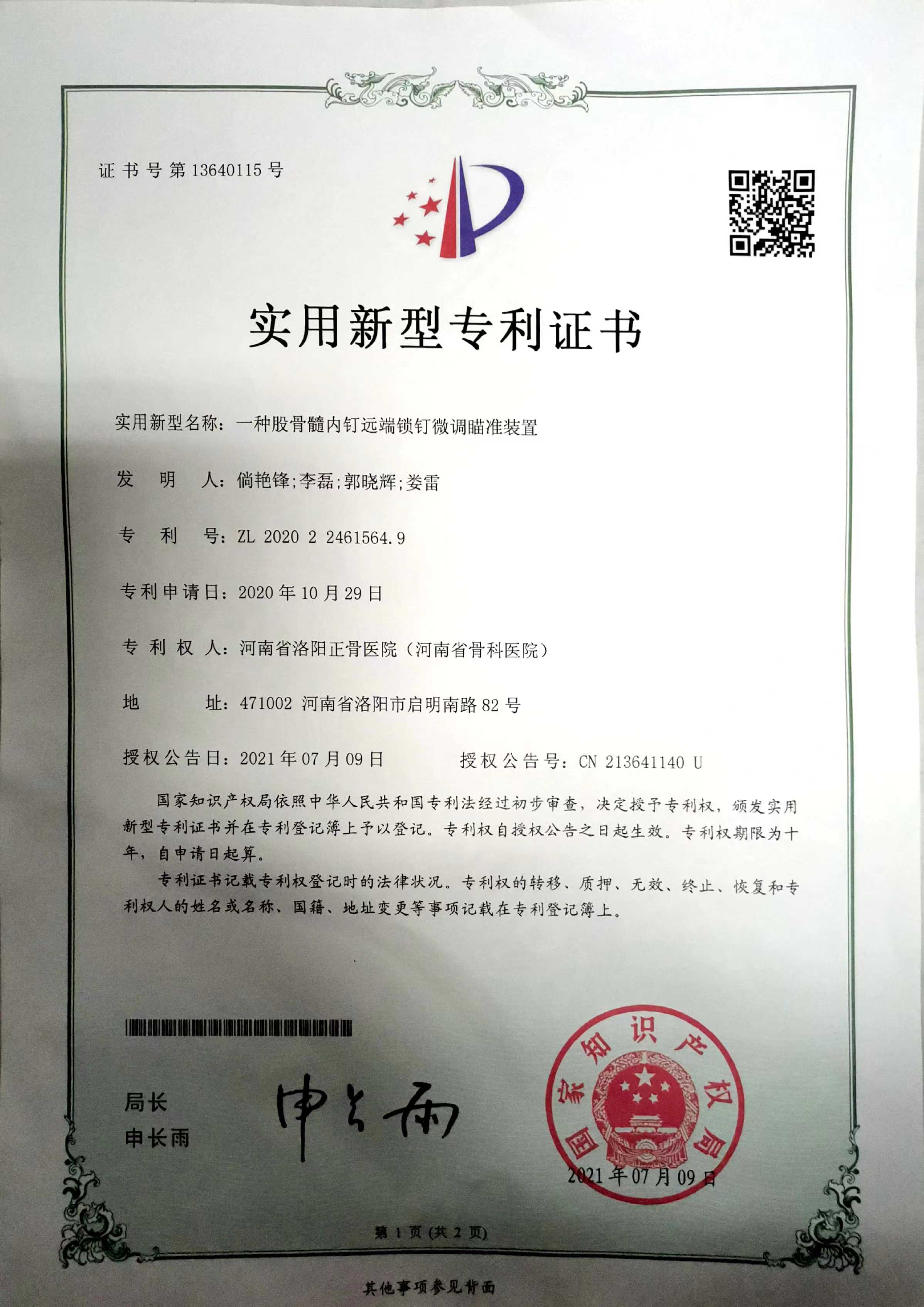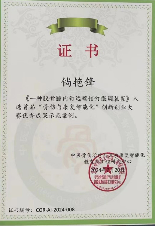 近日,我院髋关节外二科副主任医师倘艳锋参加由北京中医药大学第三附属医院、北京中医药大学科技园管理办公室、技术转移转化中心指导,中医骨伤治疗与运动康复智能化教育部工程研究中心主办,深圳平乐骨伤科医院协办的首届“骨伤与康复智能化”创新创业大赛,通过激烈初赛竞争,倘艳锋的发明专利“一种股骨远端髓内钉微调瞄准装置”进入复赛,于2024年07月06日参加线上复赛,并于2024年07月20日在广州南沙参加决赛,最终获得“骨伤与康复智能双创大赛优秀成果示范案例”。