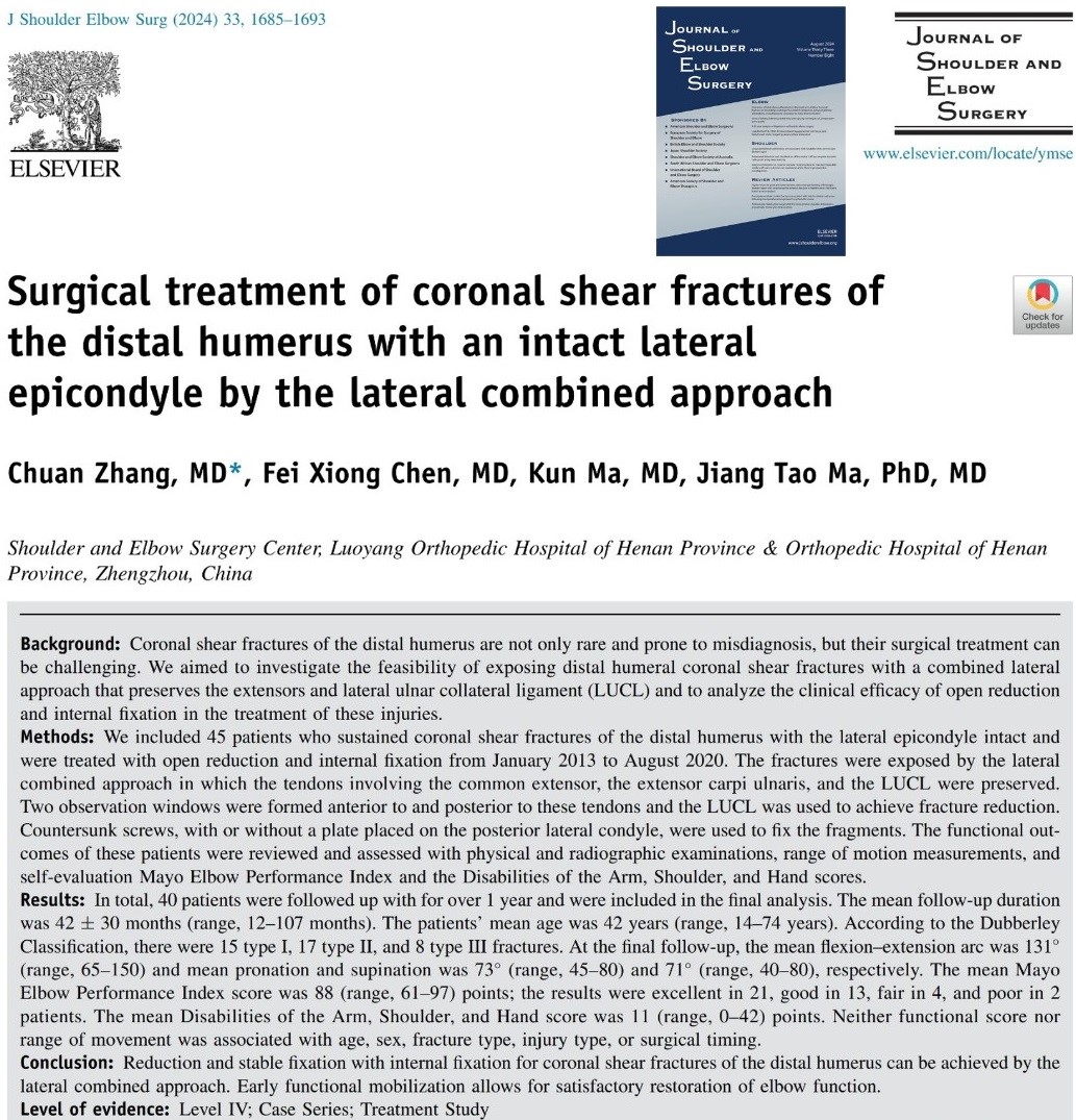 我院郑州院区肩肘外二科张川团队原创文章《Surgical treatment of coronal shear fractures of the distal humerus with an intact lateral epicondyle by the lateral combined approach(外侧前后联合入路手术治疗肱骨远端冠状面骨折)》于2024年8月在《Journal of Shoulder and Elbow Surgery(肩肘外科杂志)》在线发表。该杂志为Elsevier(爱思唯尔)出版集团旗下SCI收录期刊(影响因子2.9),国际肩肘外科领域权威杂志,以报道全球肩肘外科前沿研究成果和原创技术为主。