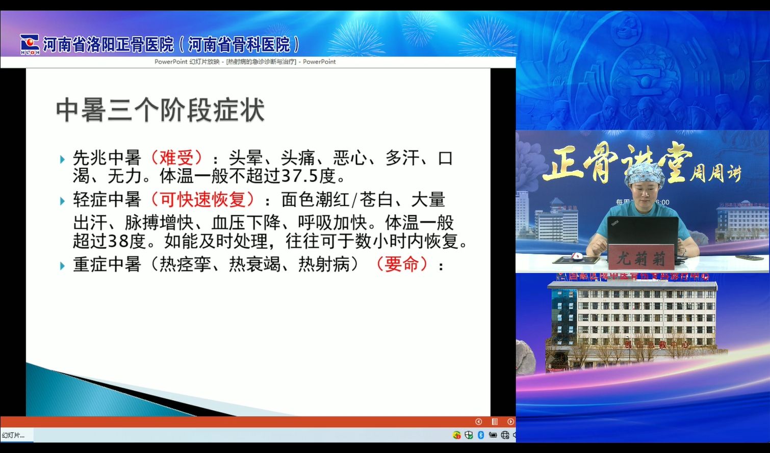 2024年7月24日,“正骨讲堂周周讲”【急诊重症 护佑生命】主题月第四期直播授课顺利开展。本期讲堂邀请我院重症医学科副主任医师尤莉莉大家分享热射病的急诊诊断和治疗。