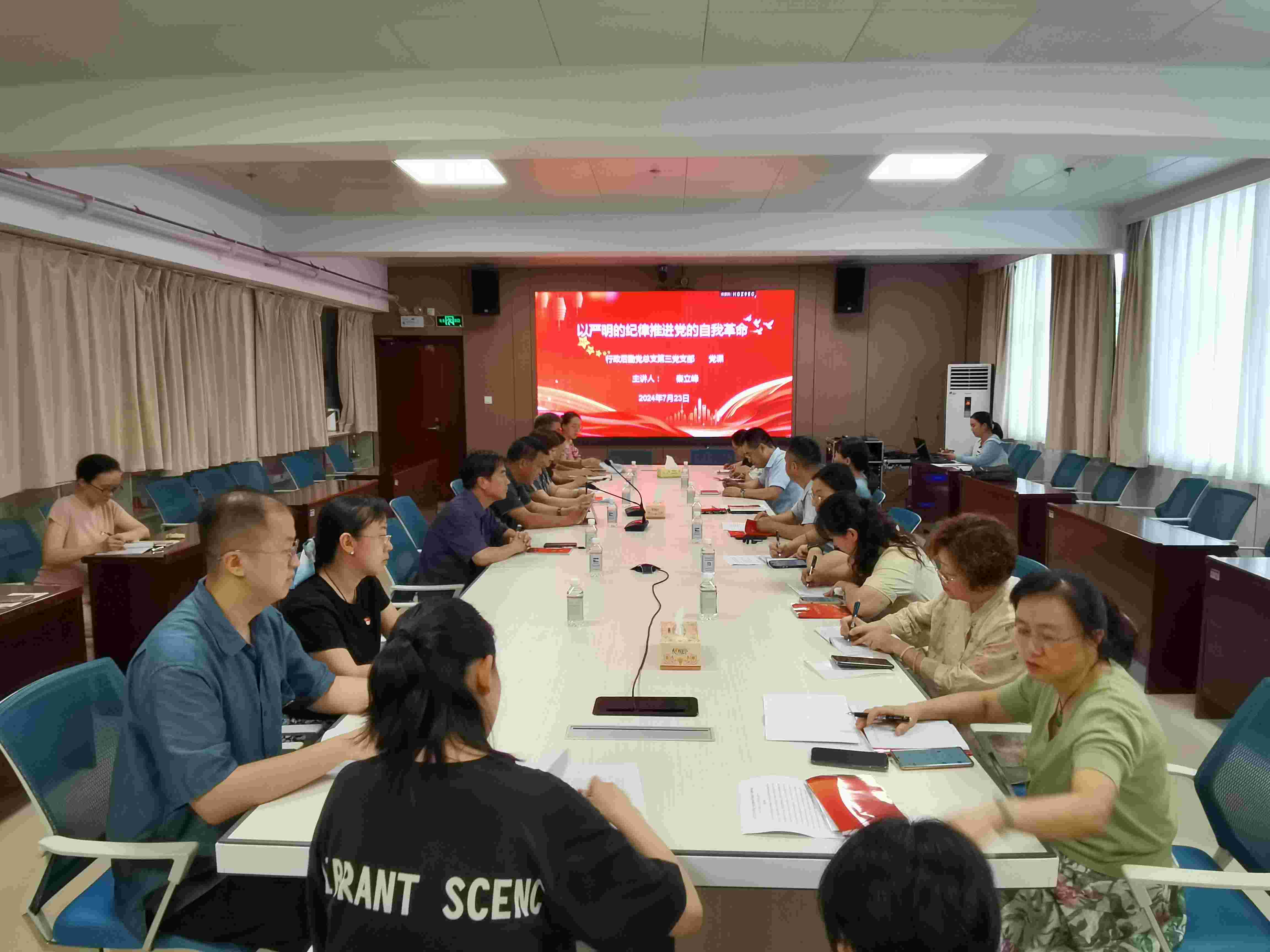 为深入学习贯彻修订后的《中国共产党纪律处分条例》(以下简称《条例》),不断深化纪律教育,推动全面从严治党向纵深发展,7月23日下午,行政党总支三支部在会议中心二楼会议室召开专题党课,此次党课由党委副书记、副院长秦立峰主讲,支部书记李海婷主持,以“以严明的纪律推进党的自我革命”为题展开。