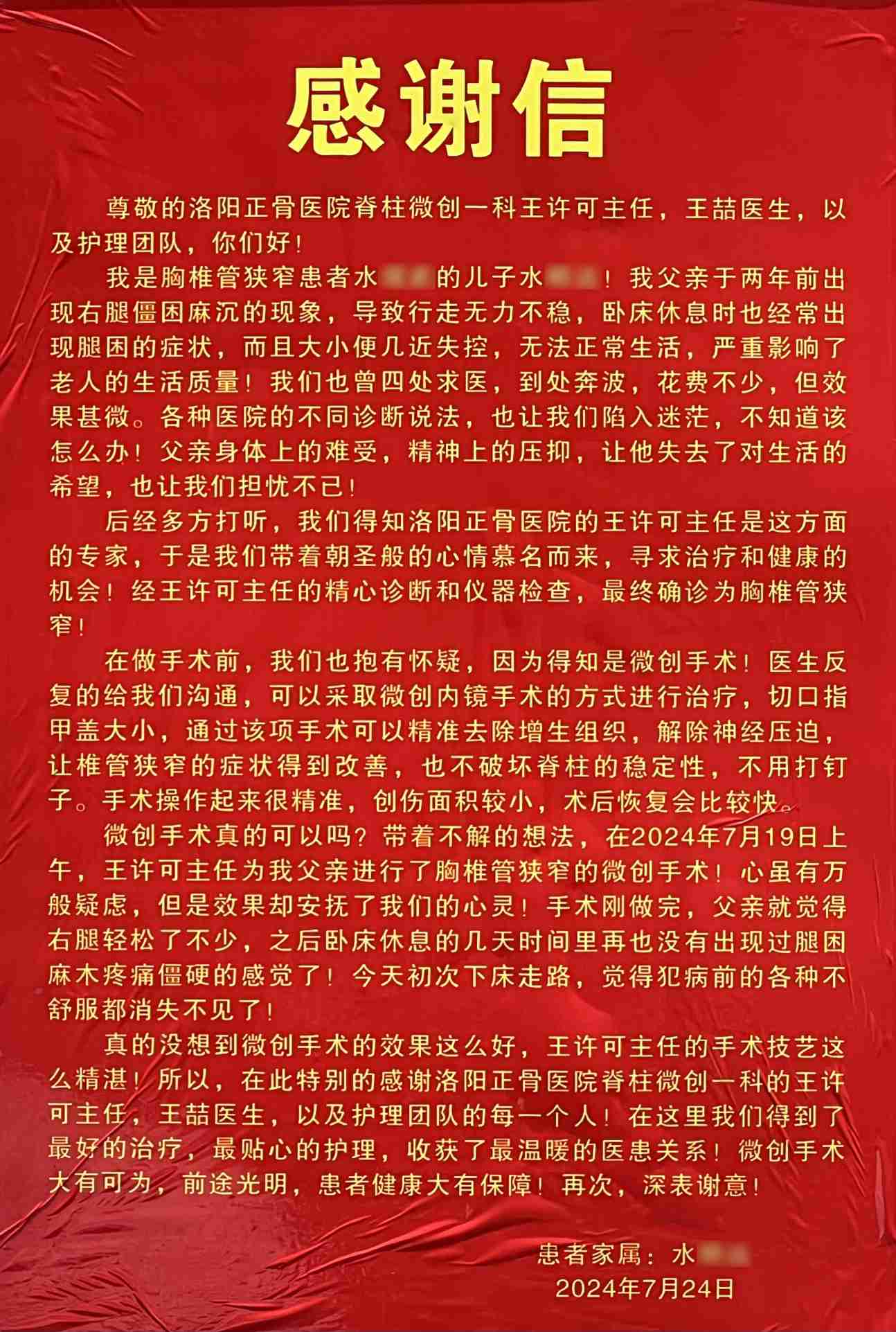 “王主任,我今天可以出院了,之前双腿发沉、僵硬,跟石头压着似的,现在一下子没了,感觉轻松了很多”。临出院前,患者和家属为表示感谢,特意送来一面锦旗和一封感谢信,以此表达对医护团队的感谢。