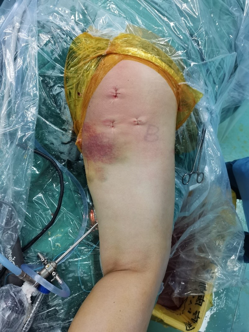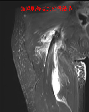 腘绳肌坐骨止点撕脱常见于短跑运动员,多发于跑步中尤其是突然用力起跑,也可发生于篮球运动起跳时。损伤后的表现是臀部疼痛,屈膝、伸髋时疼痛加重,检查可见臀部有瘀斑。我院郑州院区运动医学科黄遂柱博士团队根据小青的情况制定了科学的治疗方案。由于腘绳肌撕脱后发生肌肉回缩,肌肉断端距离坐骨结节止点大于2厘米,如果采取保守治疗则只能靠瘢痕愈合,修复慢而且术后肌肉力量会明显受影响。传统手术方案是切开手术修复撕脱的腘绳肌,但是创伤大,臀部瘢痕会给年轻爱美的女性带来不好的心理影响。为此,黄遂柱博士团队决定采取关节镜微创的手术方案,手术精准、创伤小,又不会留下令人烦恼的皮肤切口瘢痕。术中在关节镜监视下,腘绳肌被准确牢靠地修复到坐骨结节解剖位置,术后患者感到十分满意,表示没有疼痛不适。