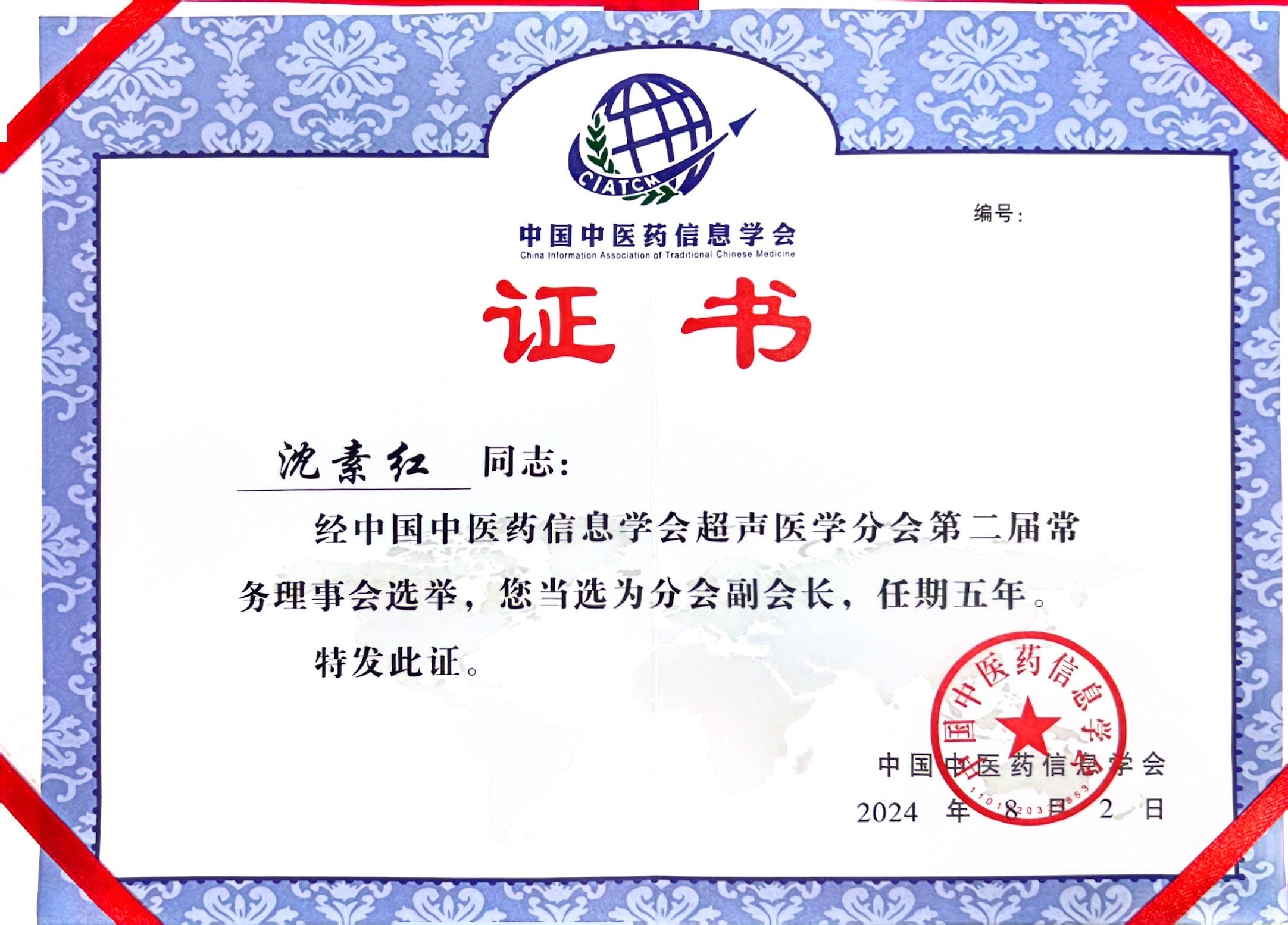 在8月2日晚上举行的换届选举会议上,我院功能检查中心主任沈素红再次连任中国中医药信息学会超声医学分会副会长,功能检查中心副主任付卓当选为青年理事。换届会议由中国中医药信息学会副会长兼执行秘书长朱佳卿主持。