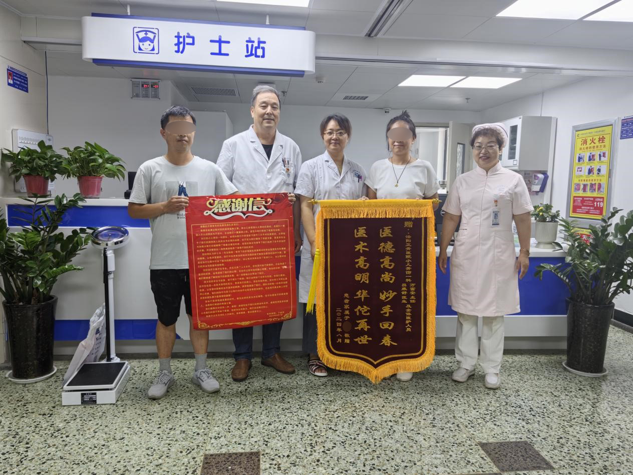 8月8日,在小儿骨伤一科护士站,来了一对年轻夫妻,一人拿着感谢信,一人拿着锦旗,拉着万富安主任和吕秉舒医生的手,不断说着:“感谢!感谢!”