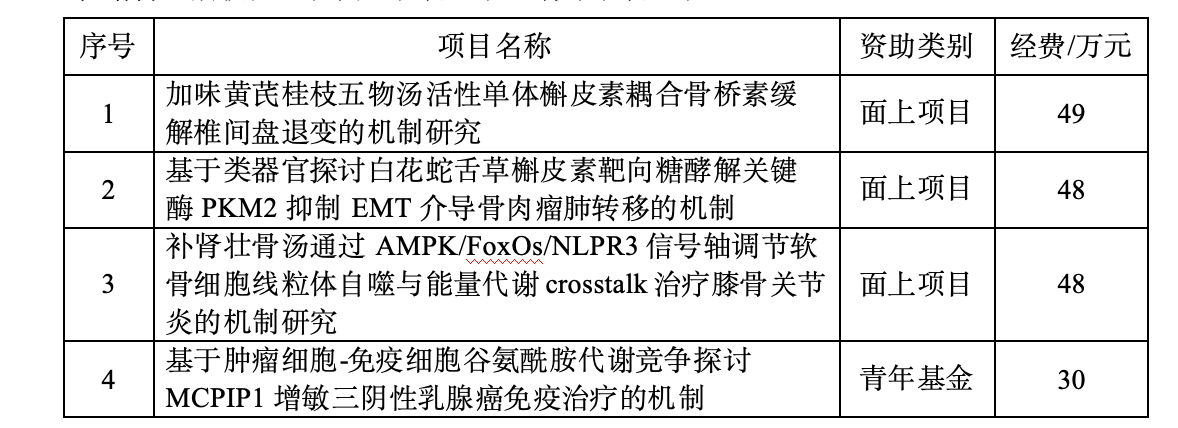 8月23日,国家自然科学基金委员会发布了2024年度国家自然科学基金集中接收申请项目立项名单,我院申报的《加味黄芪桂枝五物汤活性单体槲皮素耦合骨桥素缓解椎间盘退变的机制研究》,获面上项目立项,资助经费49万元。另外,我院3位在站博士后获批立项面上项目2项、青年项目1项。
