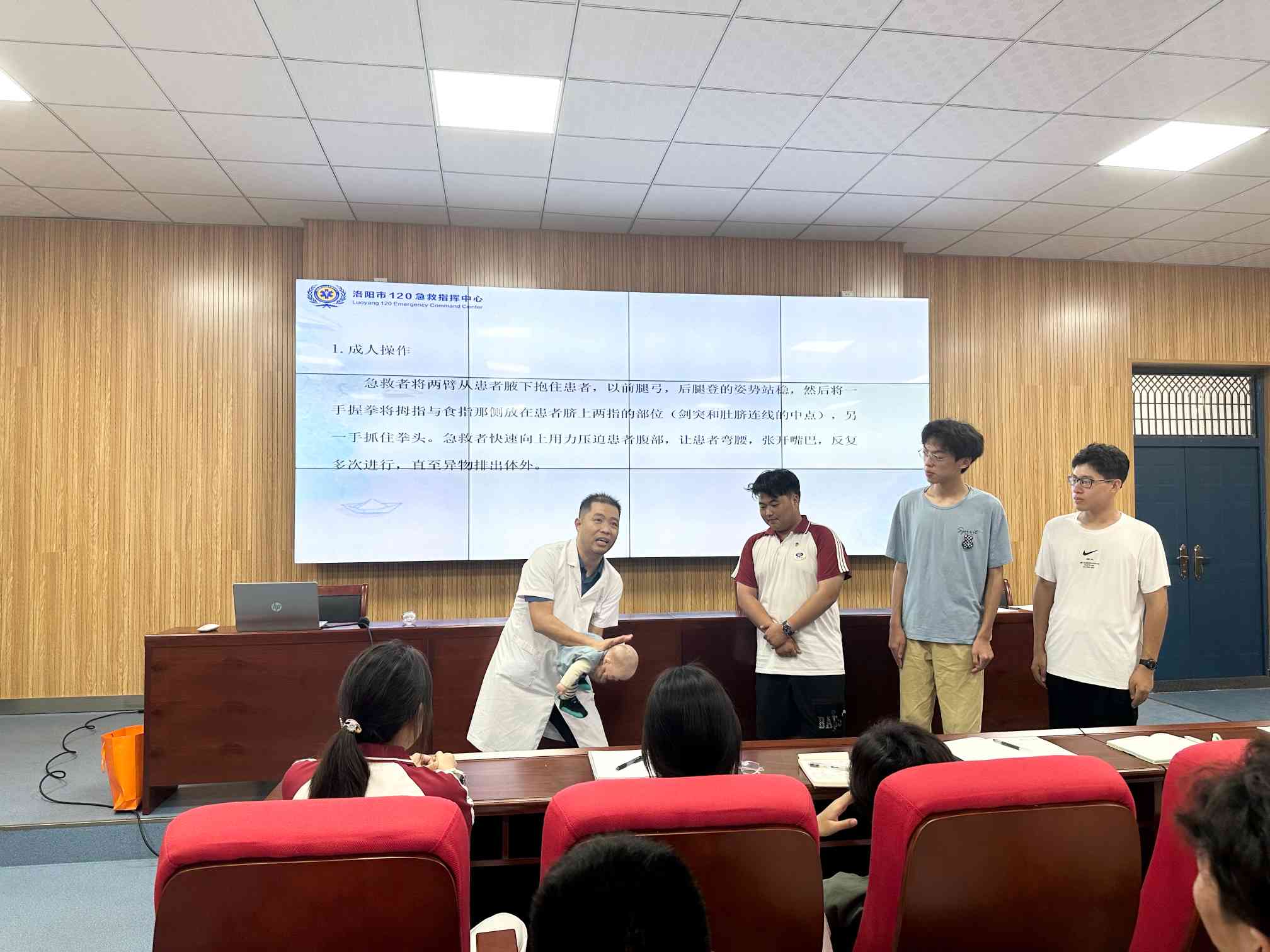 培训现场,我院120中心主任王慧彪为大家讲解了创伤现场急救的方法以及AED的使用方法,外科副主任杨建晓为大家讲解了海姆立克急救法,急诊科护士郝鹏为大家讲解了单人徒手心肺复苏术。他们用通俗易懂的语言向学生们讲解了急救的重要性和紧迫性,从如何正确拨打120急救电话,到遇到突发状况时应保持冷静、迅速判断情况,每一个环节都详细阐述。