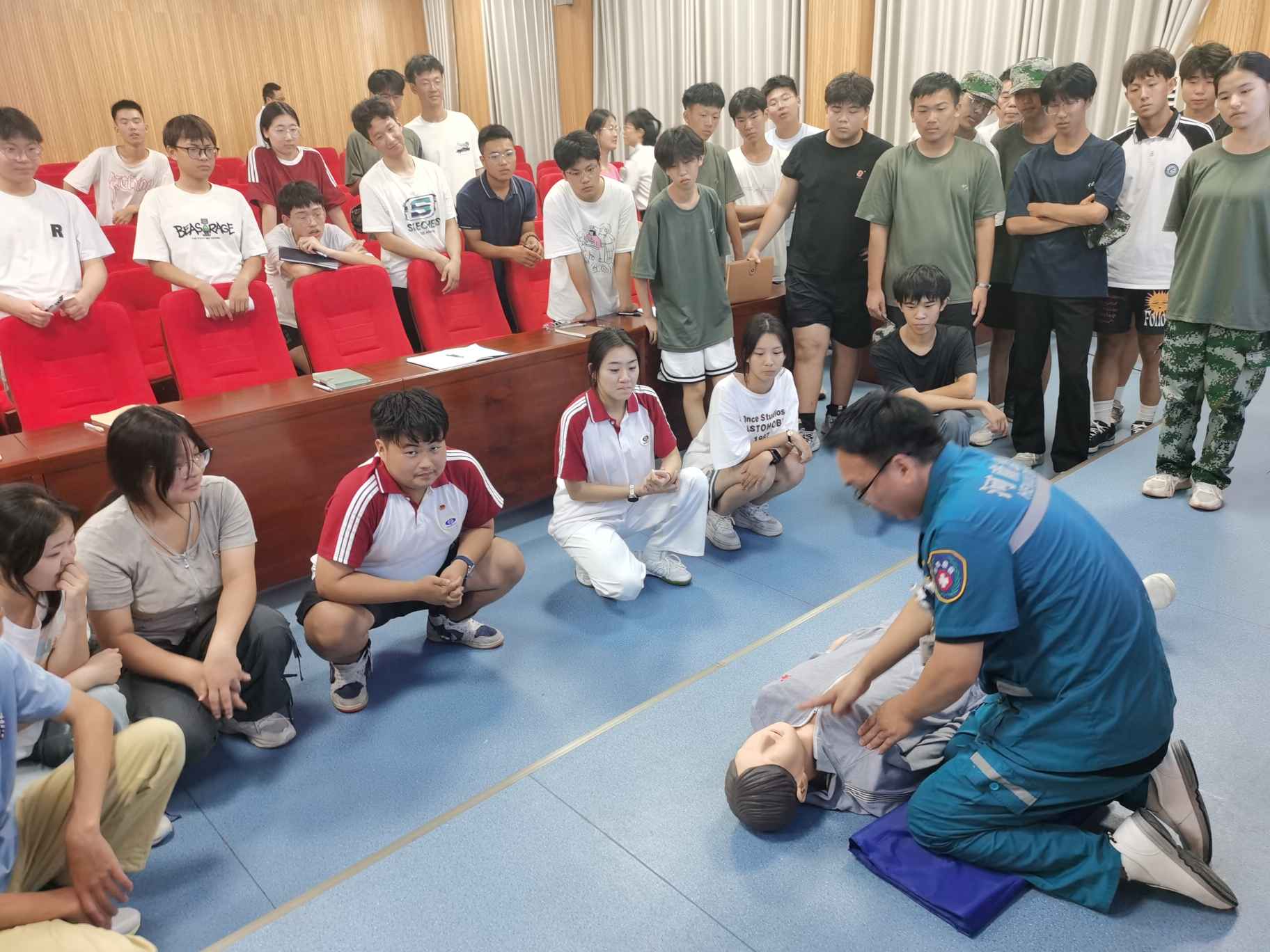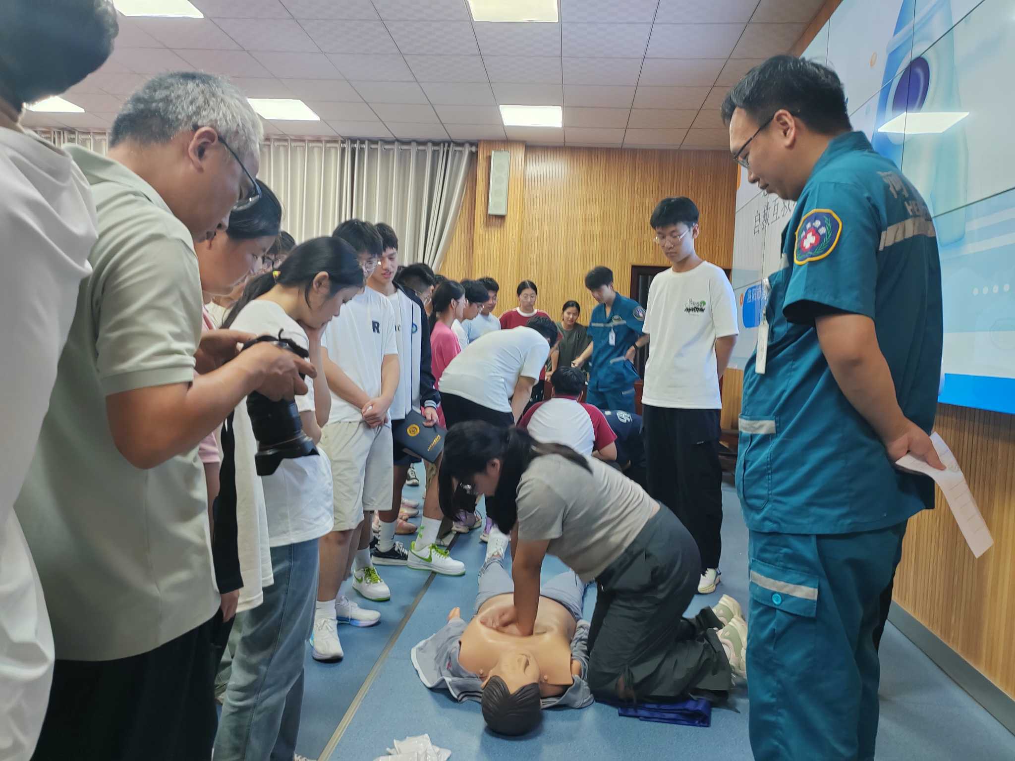 随后,学生们纷纷踊跃参与实际操作。在医护人员的耐心指导下,他们认真地进行着每一个动作,从按压的力度到频率,从开放气道的方法到人工呼吸的技巧,都力求做到准确无误,在医护人员的鼓励和纠正下,大家逐渐掌握了正确的方法。