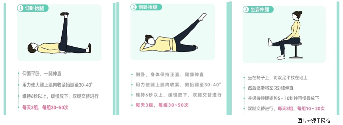 2.功能锻炼:如踝泵运动、直腿抬高、侧腿抬高,加强股四头肌的锻炼,可以增加膝关节的稳定性,可促进膝关节周围肌肉、韧带的血液循环,也有利于半月板损伤的恢复。