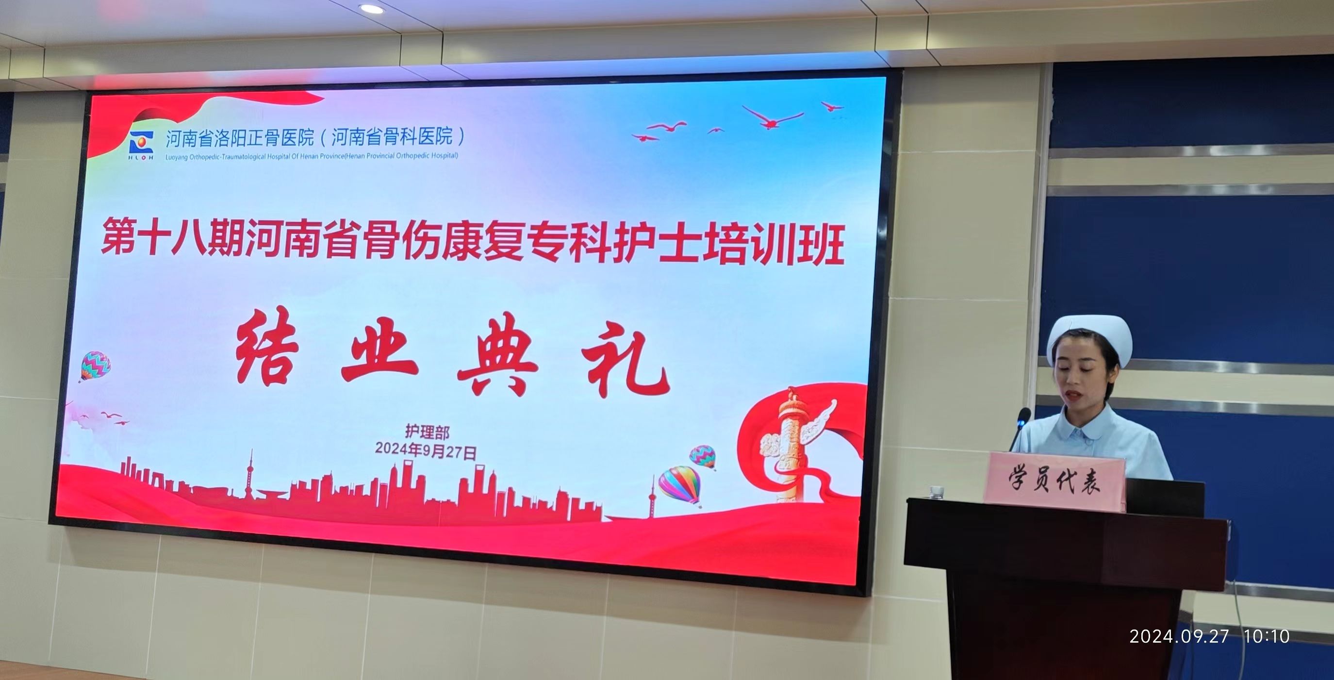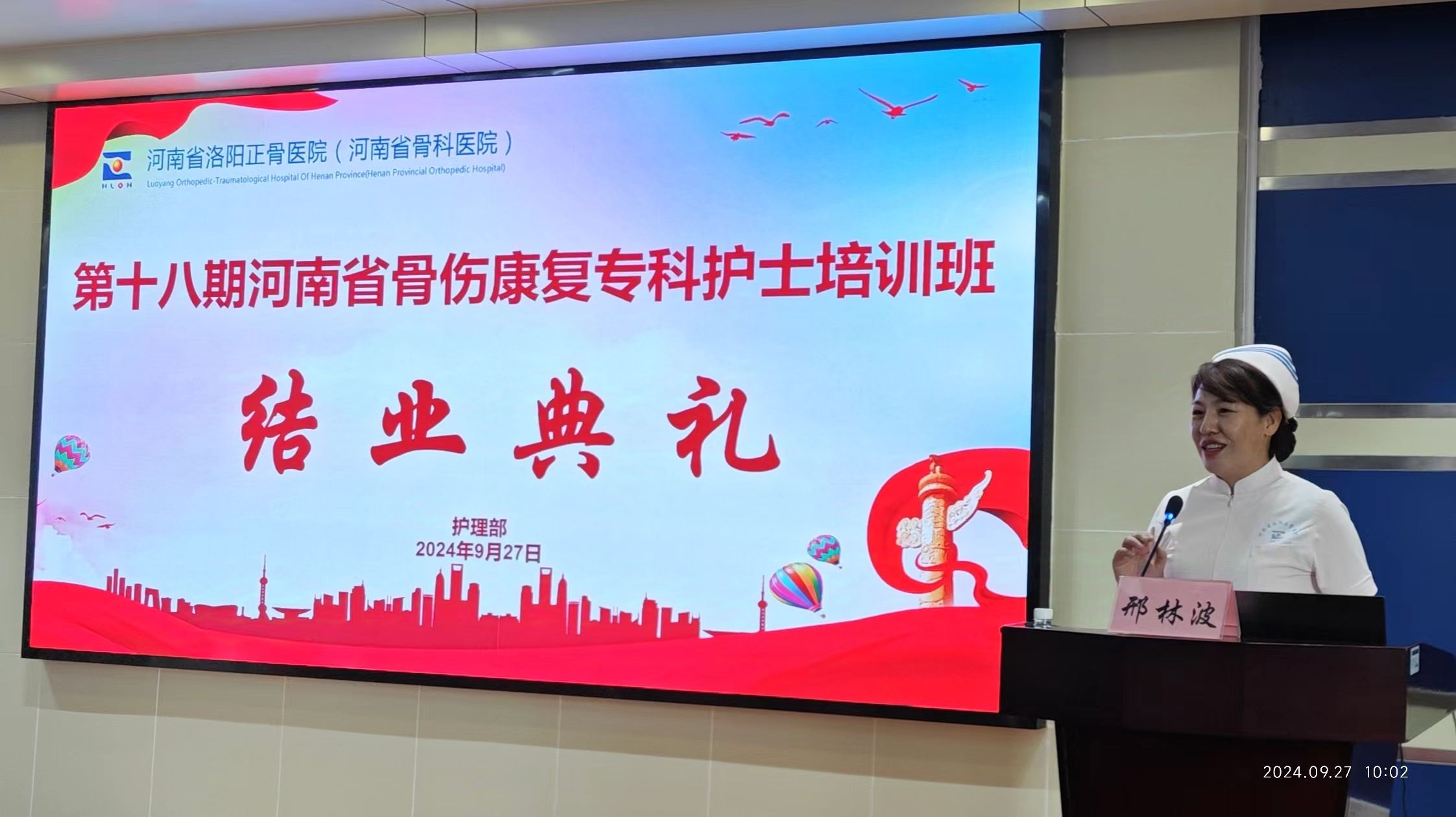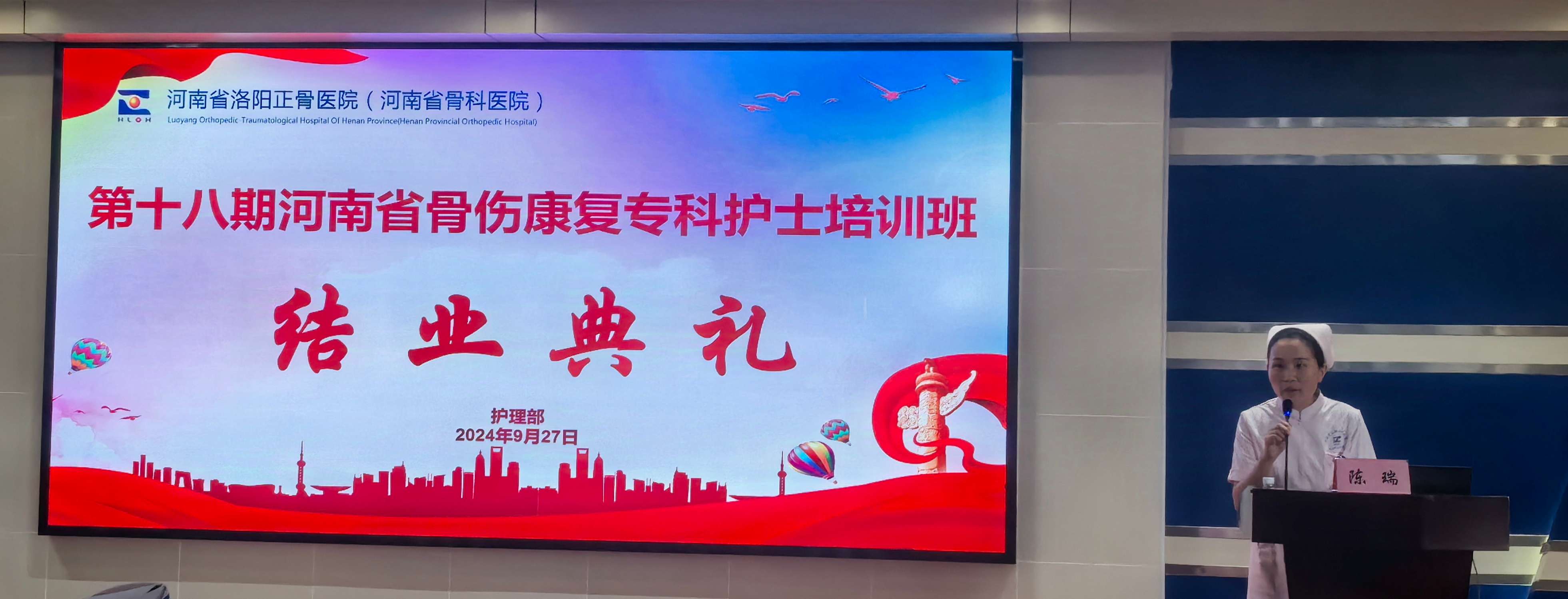 迢迢新秋夕,亭亭月将圆。2024年9月27日上午,第18期河南省骨伤康复专科护士培训班结业典礼在我院3号楼5楼学术报告厅顺利举行,至此,为学员们三个月紧张又充实的理论学习及临床实践画上圆满的句号。我院护理部主任邢林波、部分临床科室护士长及全体学员参加,仪式由护理部干事陈瑞主持。