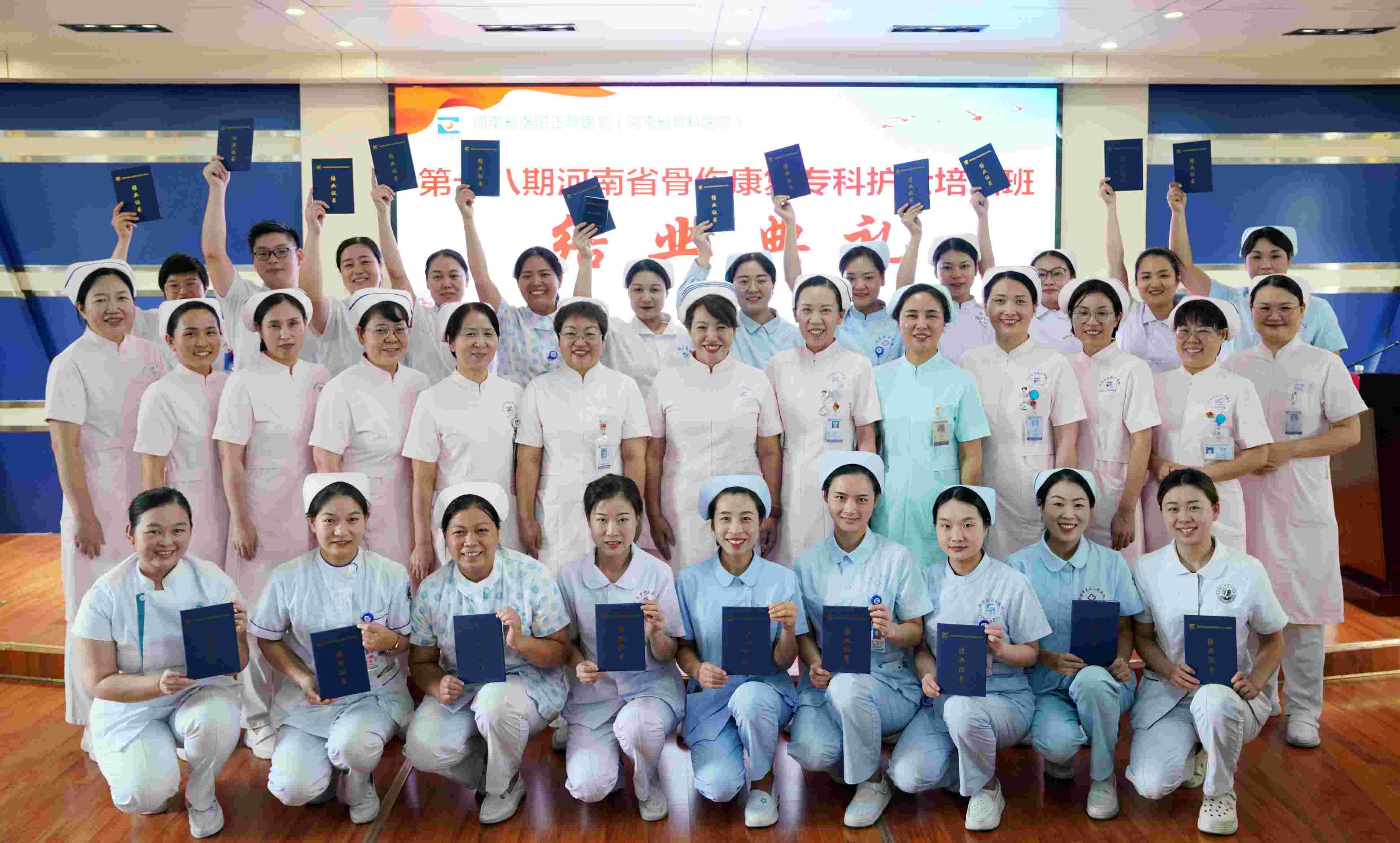 仪式最后,由在场的主任及护士长为顺利结业的学员颁发结业证书及河南省骨伤康复专科护士培训合格证书。