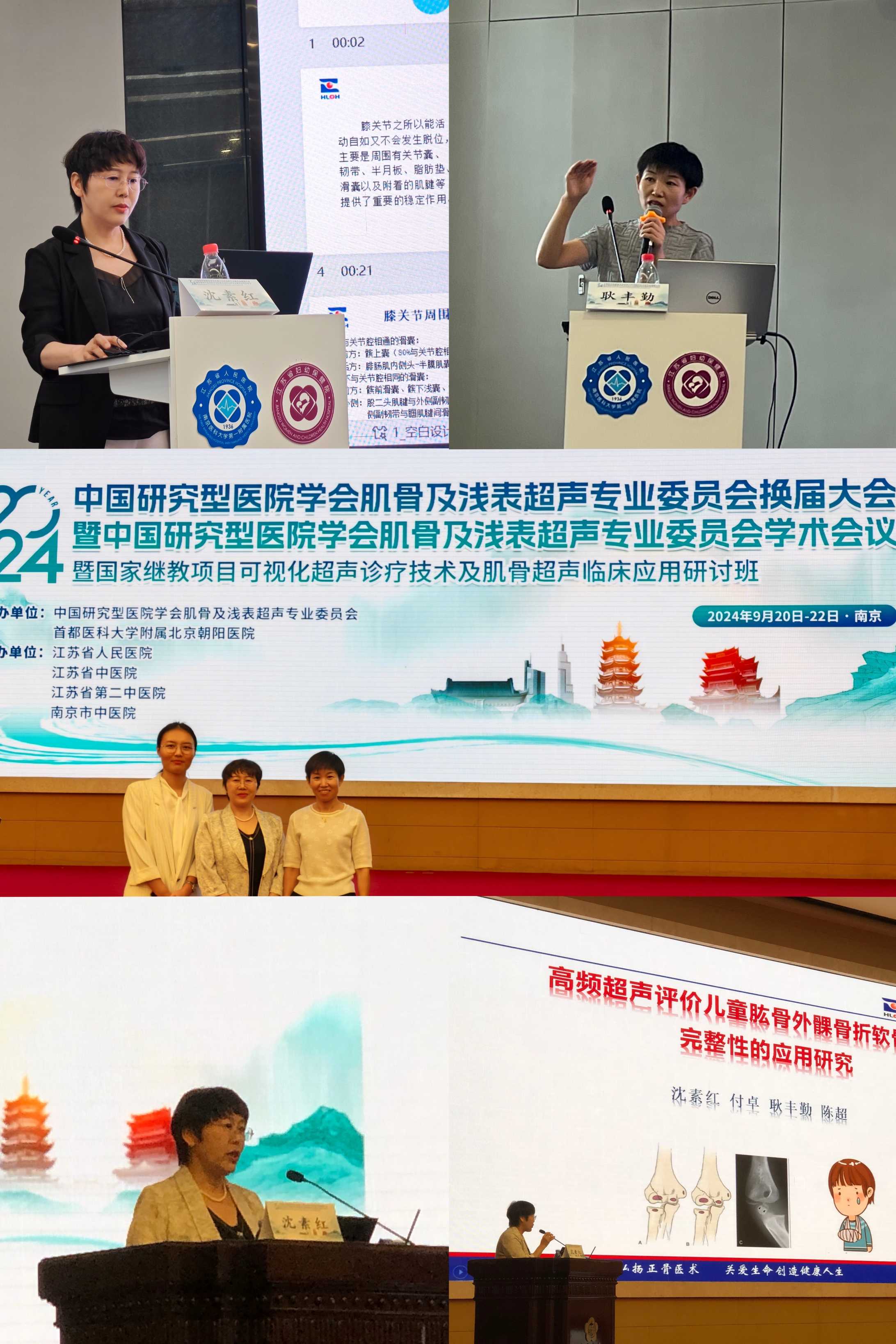 9月18日-22日,沈素红主任带领团队骨干成员耿丰勤、陈超赴南京参加中国研究型医院学会肌骨及浅表超声专业委员会换届大会暨2024年学术会议暨国家级继教项目“可视化超声诊疗技术及肌骨超声临床应用研讨班”。在9月19日-20日举办的国家级继教项目“可视化超声诊疗技术及肌骨超声临床应用研讨班”上,沈素红主任及耿丰勤医师分别进行了“膝关节超声解剖、常见疾病临床表现及精准诊疗”、“髋关节超声解剖、常见疾病临床表现及精准诊疗”的精彩授课及课后的带教演示,受到了参会学员的高度认可和一致好评。在9月20日晚举办的换届选举大会上,沈素红主任当选为第二届中国研究型医院学会肌骨及浅表超声专业委员会常务委员兼副秘书长,耿丰勤医师和陈超医师分别当选为委员及青年委员。在21日-22日的中国研究型医院学会肌骨及浅表超声专业委员会学术大会上,沈素红主任做了题为《高频超声评估儿童肱骨外髁骨折软骨铰链完整性的应用研究》的优秀论文分享,受到了与会者的高度关注和极大兴趣,展示了我院在肌骨超声领域的探索和创新。