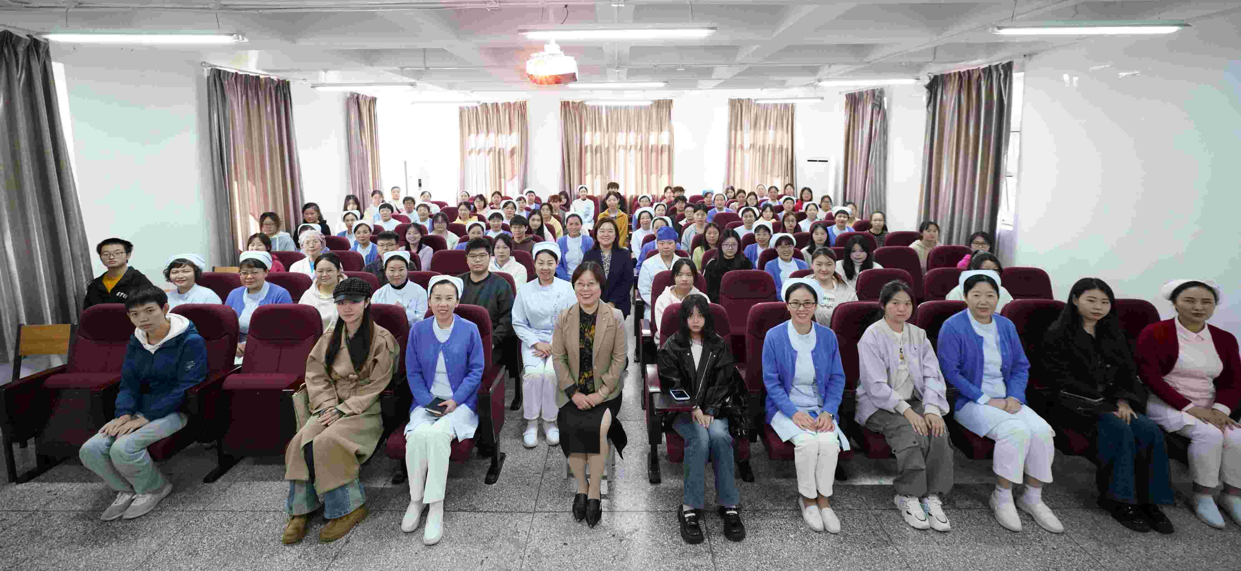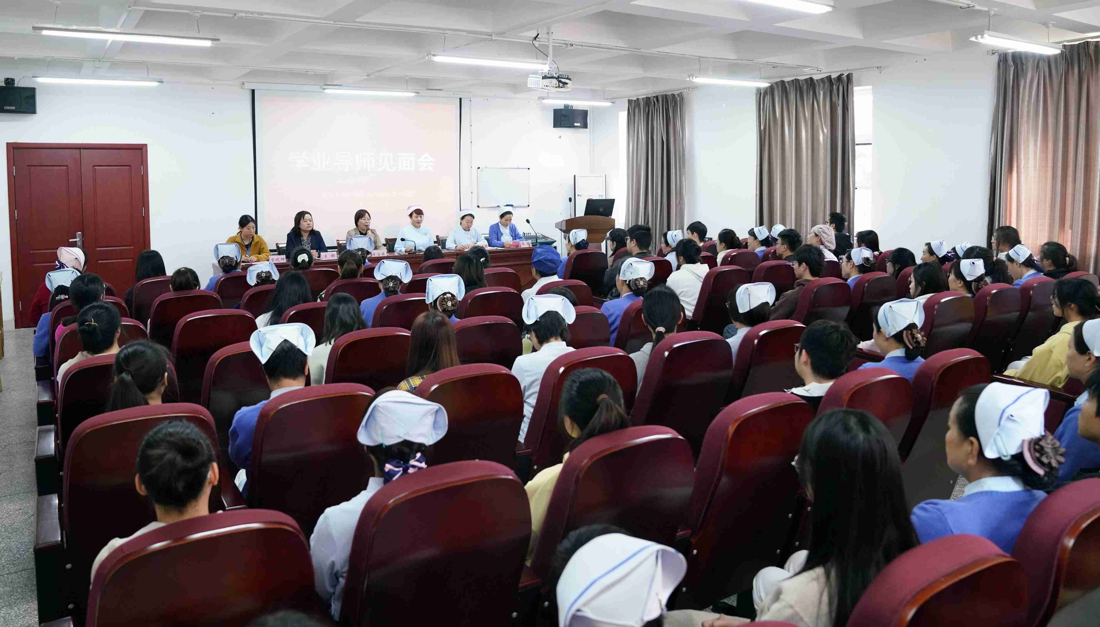 会议由教学部副主任王彬和护理部陈瑞共同主持,教学部主任李海婷,护理部主任邢林波、副主任焦瑞娜,教学部贾屹坤,以及48位学业导师和湖南中医药大学湘杏学院护理9班的51名学生共同参与了此次见面会。