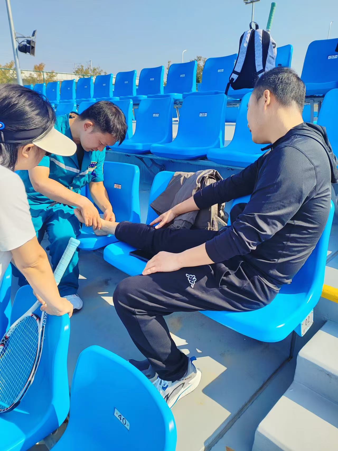 网球运动员们在赛场上全力拼搏,难免会出现意外受伤的情况。急救医护人员们总是能第一时间冲上前去救治。对于扭伤的运动员,他们熟练地进行冷敷、包扎和固定;对于擦伤的运动员,他们仔细地清理伤口、消毒;对于出现身体不适的运动员,他们耐心地询问症状、进行检查并给予相应的治疗。