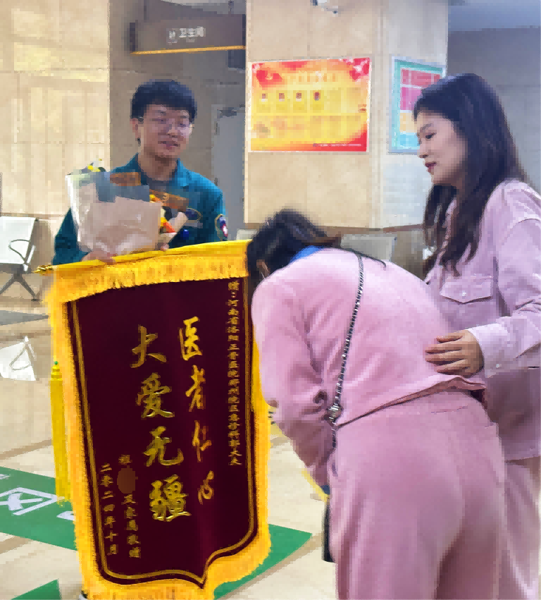 2024年10月26日,在我院郑州院区急诊科大厅内,上演了一幕温馨感人的场景:一位素未谋面的病人家属,特意制作了一面写有“医者仁心,大爱无疆”的锦旗,赠与急诊科医生郭帆,以表达对郭帆深深的感激之情。