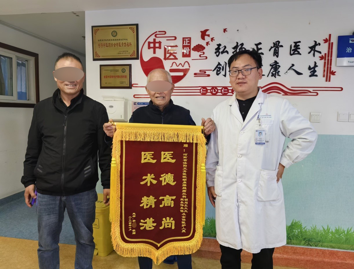 2024年10月28日,患者李先生及家属将一面写有“医德高尚,医术精湛”的锦旗送到了颈肩腰腿痛(推拿)三科医护人员的手中,并再三感谢了宋永伟主任、胡闯北医生精湛的医术,感谢了护理人员细心的照顾。