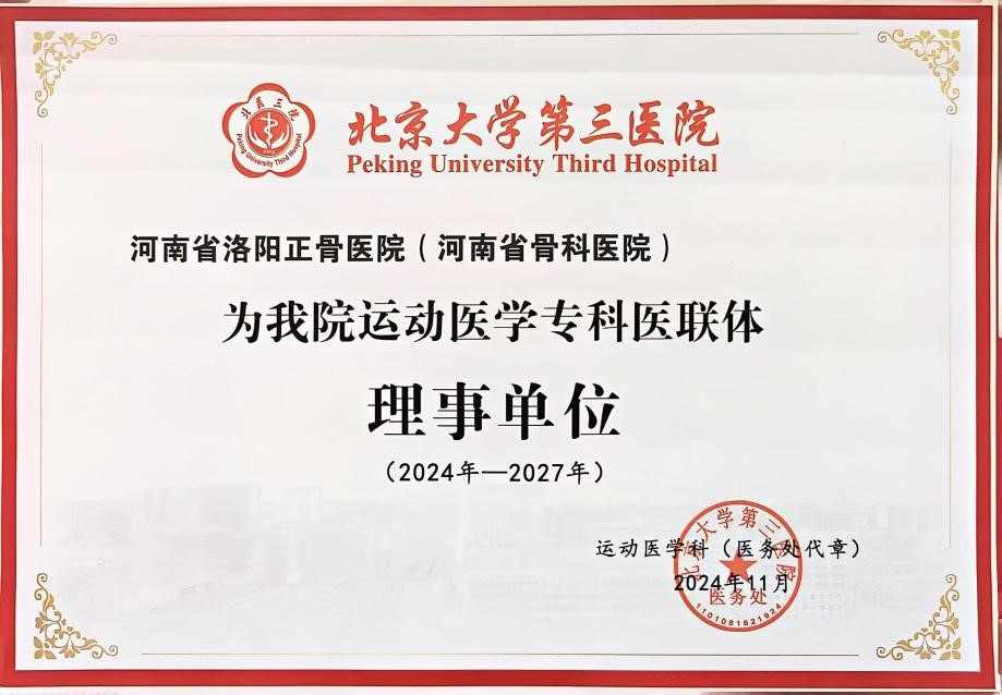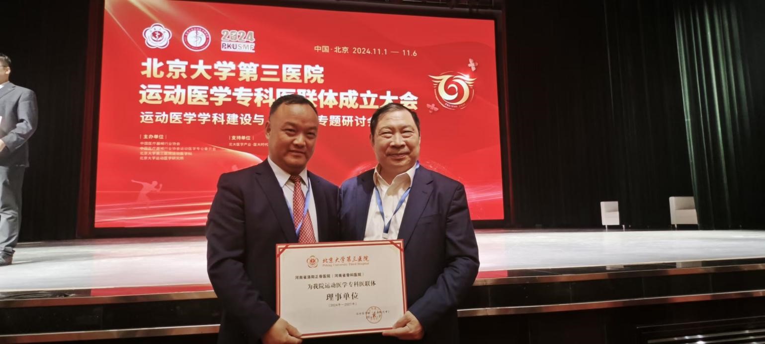 2024年11月1日,北京大学第三医院运动医学专科医联体成立大会在北京成功举办。会上,我院正式成为北京大学第三医院运动医学专科医联体理事单位。我院院长助理、郑州院区运动医学科主任黄遂柱,运动医学诊疗中心主任谭红略及运动医学关节镜一科副主任医师杨澜波前往北京参会,并在大会上领取了理事单位证书。